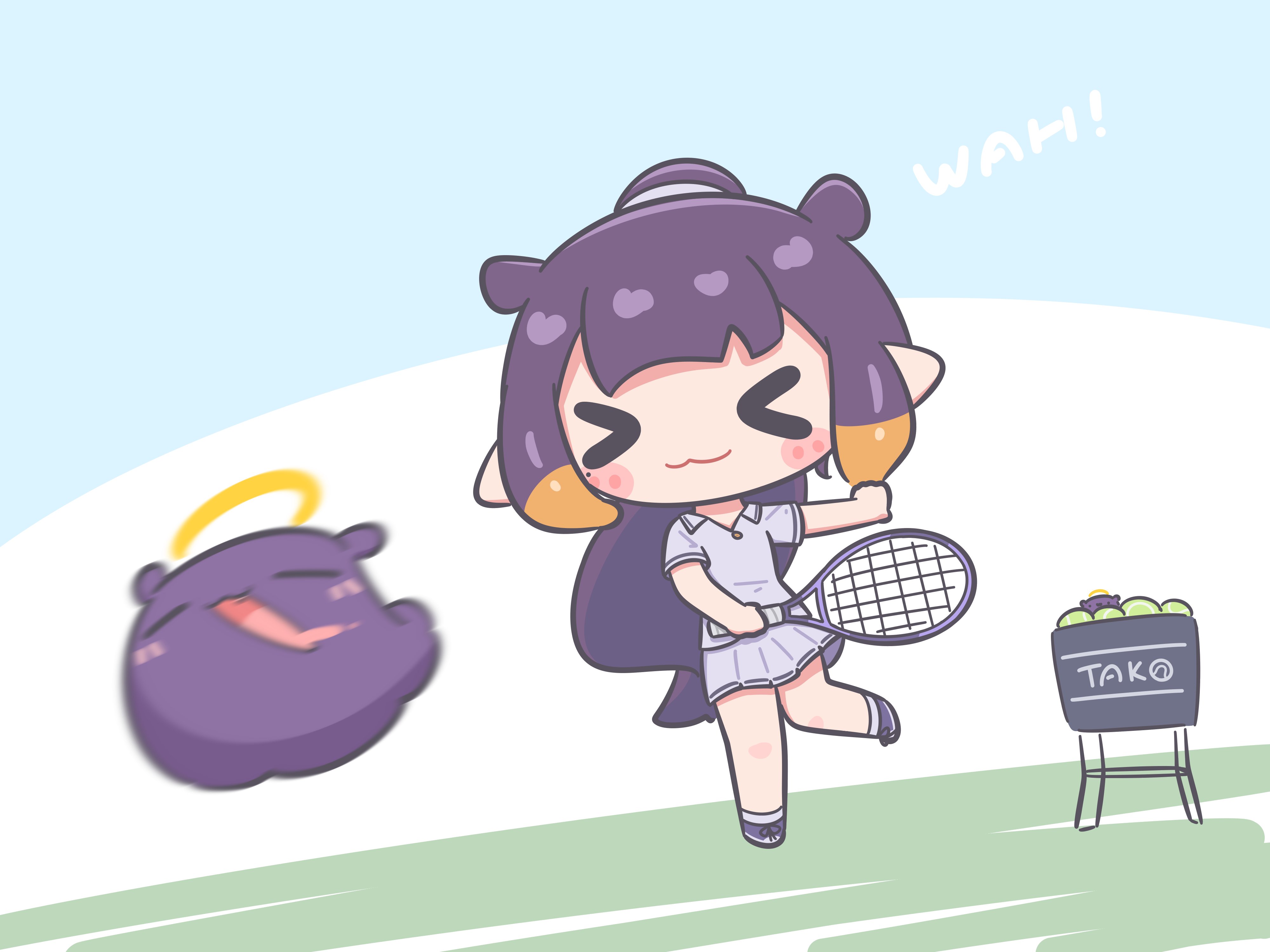 >_< 1girl :3 absurdres alternate_costume ball basket commentary english_commentary halo highres hololive hololive_english mole mole_under_eye mpien multicolored_hair ninomae_ina'nis open_mouth orange_hair outstretched_arm ponytail purple_hair racket skirt smile takodachi_(ninomae_ina'nis) tennis tennis_ball tennis_racket tentacle_hair virtual_youtuber