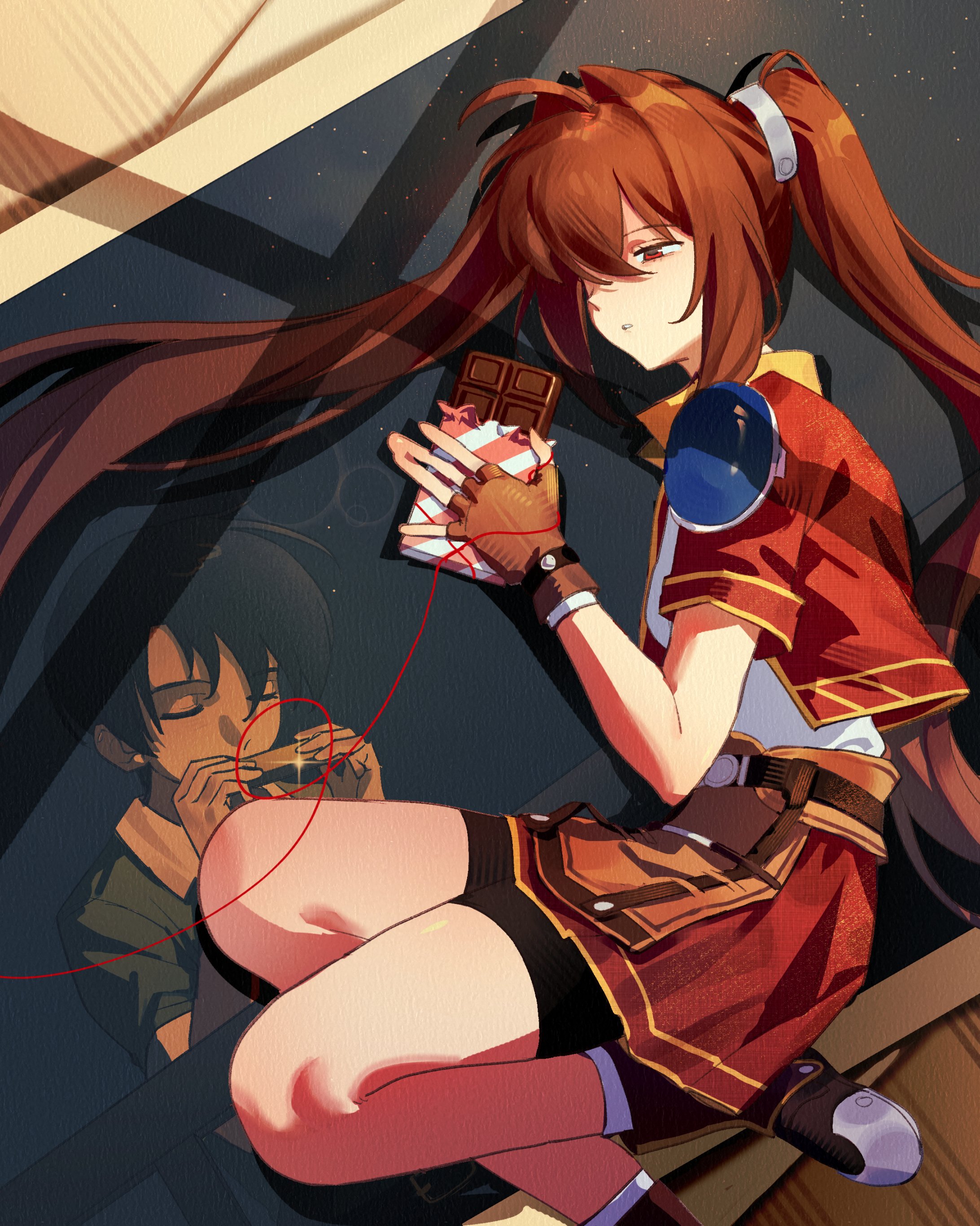 1boy 1girl absurdres ahoge antenna_hair armor bike_shorts bike_shorts_under_skirt brown_gloves brown_hair candy chocolate chocolate_bar commentary cropped_jacket double-parted_bangs eiyuu_densetsu estelle_bright fingerless_gloves food glint gloves hair_between_eyes hair_intakes harmonica highres holding holding_chocolate holding_food holding_instrument ikarashi_(dasijie77077) instrument joshua_bright long_hair music pauldrons playing_instrument red_eyes shoes short_sleeves shorts shorts_under_skirt shoulder_armor single_pauldron sneakers sora_no_kiseki twintails untranslatable_commentary very_long_hair