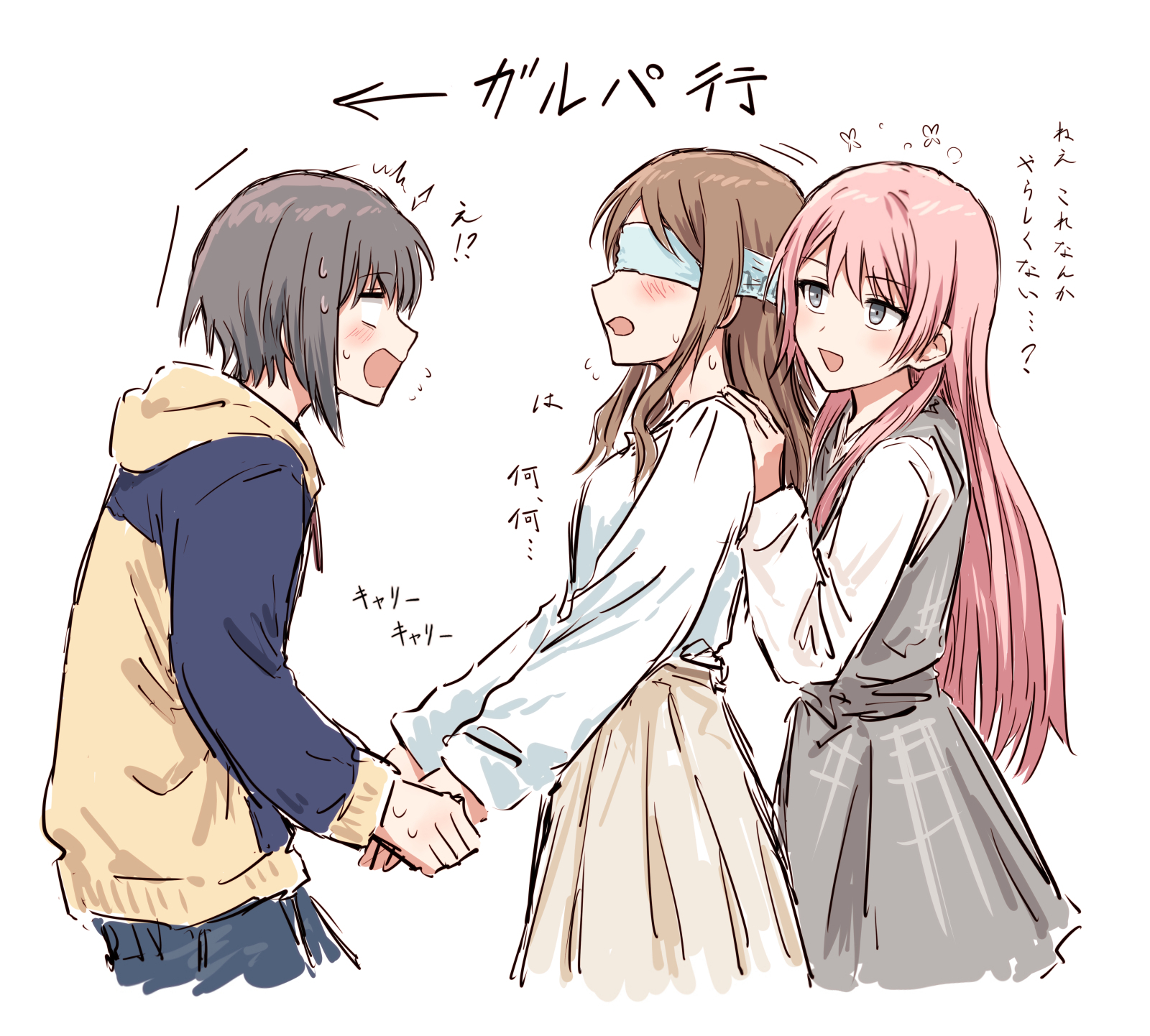 3girls :d bad_id bad_twitter_id bang_dream! bang_dream!_it's_mygo!!!!! blank_eyes blindfold blue_hoodie brown_hair chihaya_anon dress flying_sweatdrops green_eyes grey_dress grey_hair highres hood hoodie long_hair long_sleeves multiple_girls nagasaki_soyo nervous_sweating open_mouth pinafore_dress pink_hair profile shirt simple_background skirt sleeveless sleeveless_dress smile sweat takamatsu_tomori translation_request two-tone_hoodie white_background white_shirt yellow_hoodie yellow_skirt yukitake_(bullfalk)