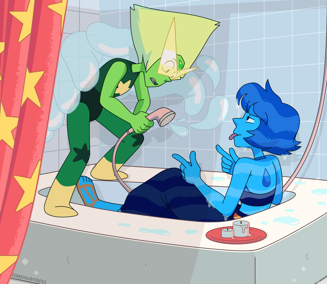 2girls artist_name bathtub blue_gem blue_hair blue_skin candle colored_skin commentary english_commentary face_shield forehead_jewel gem gem_(steven_universe) green_skin hands_up holding holding_shower_head in_bathtub indoors l_hand lapis_lazuli_(steven_universe) leotard looking_at_another multiple_girls official_style open_mouth peridot_(steven_universe) short_hair shower_curtain shower_head sitting star_(symbol) steven_universe teeth timehuntress tongue tongue_out triangle-shaped_hair upper_teeth_only water