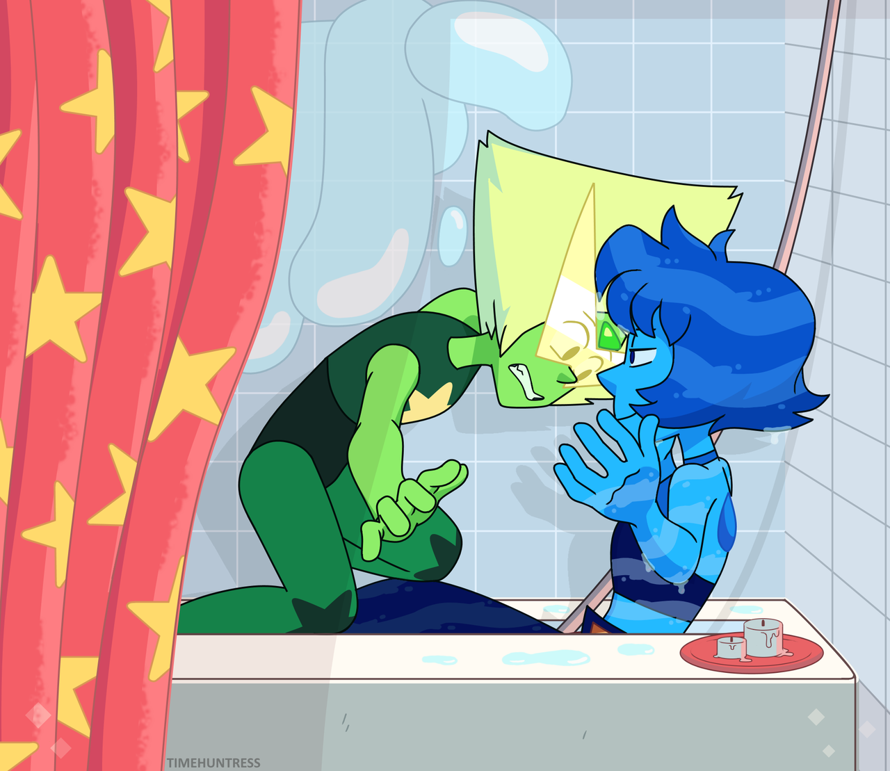 2girls artist_name bathtub blue_gem blue_hair blue_skin candle clenched_teeth closed_mouth colored_skin commentary english_commentary face_shield forehead_jewel from_side gem gem_(steven_universe) green_skin hands_up in_bathtub indoors lapis_lazuli_(steven_universe) leotard looking_at_another multiple_girls official_style peridot_(steven_universe) short_hair shower_curtain sitting star_(symbol) steven_universe teeth timehuntress triangle-shaped_hair water