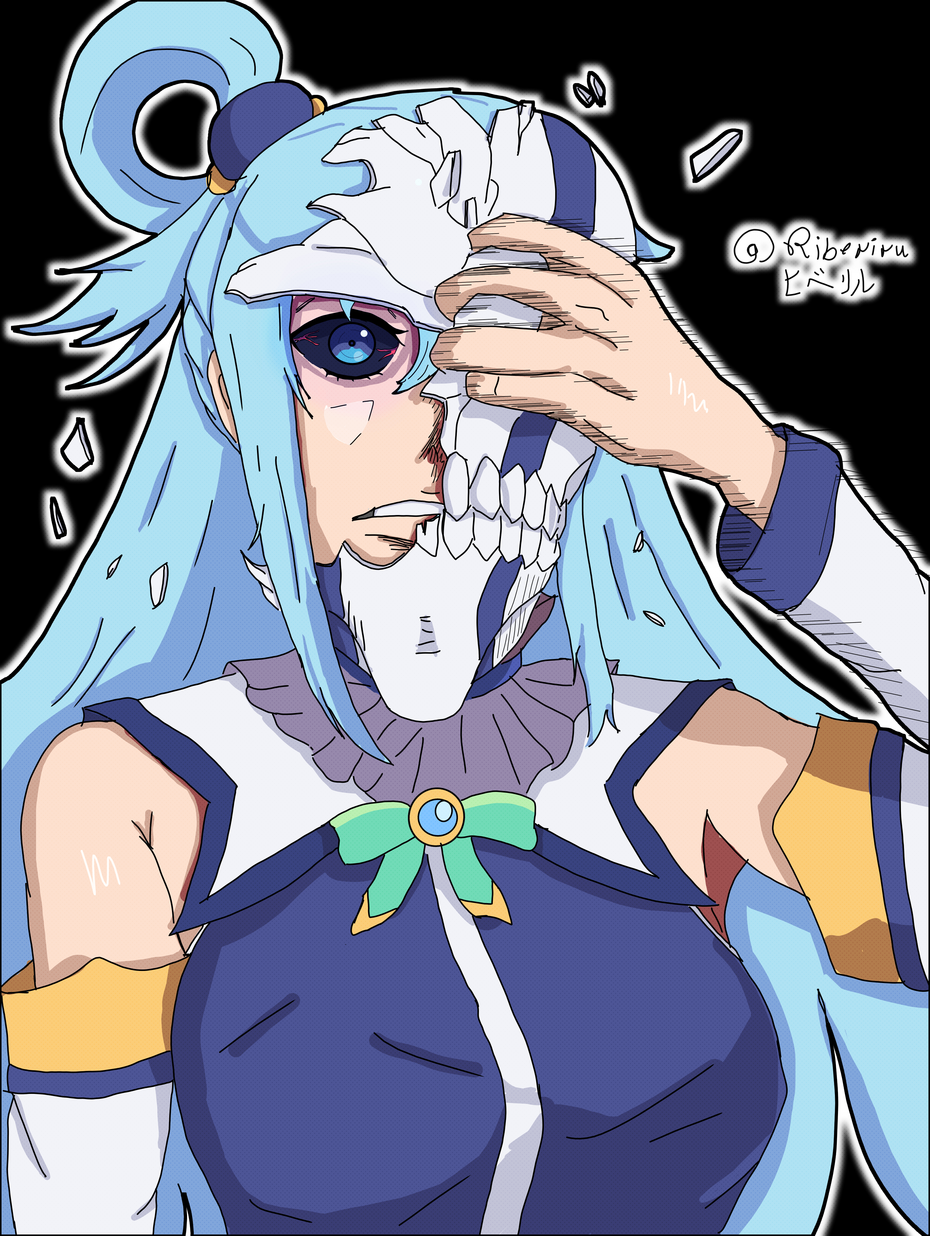 1girl absurdres aqua_(konosuba) black_sclera bleach blue_eyes blue_hair blue_shirt bow breasts colored_sclera commentary crossover dark_persona detached_sleeves gag green_bow hair_ornament hair_rings highres hollow_mask kono_subarashii_sekai_ni_shukufuku_wo! long_hair mask parody pixel_art riberiru shirt single_hair_ring solo sphere_hair_ornament