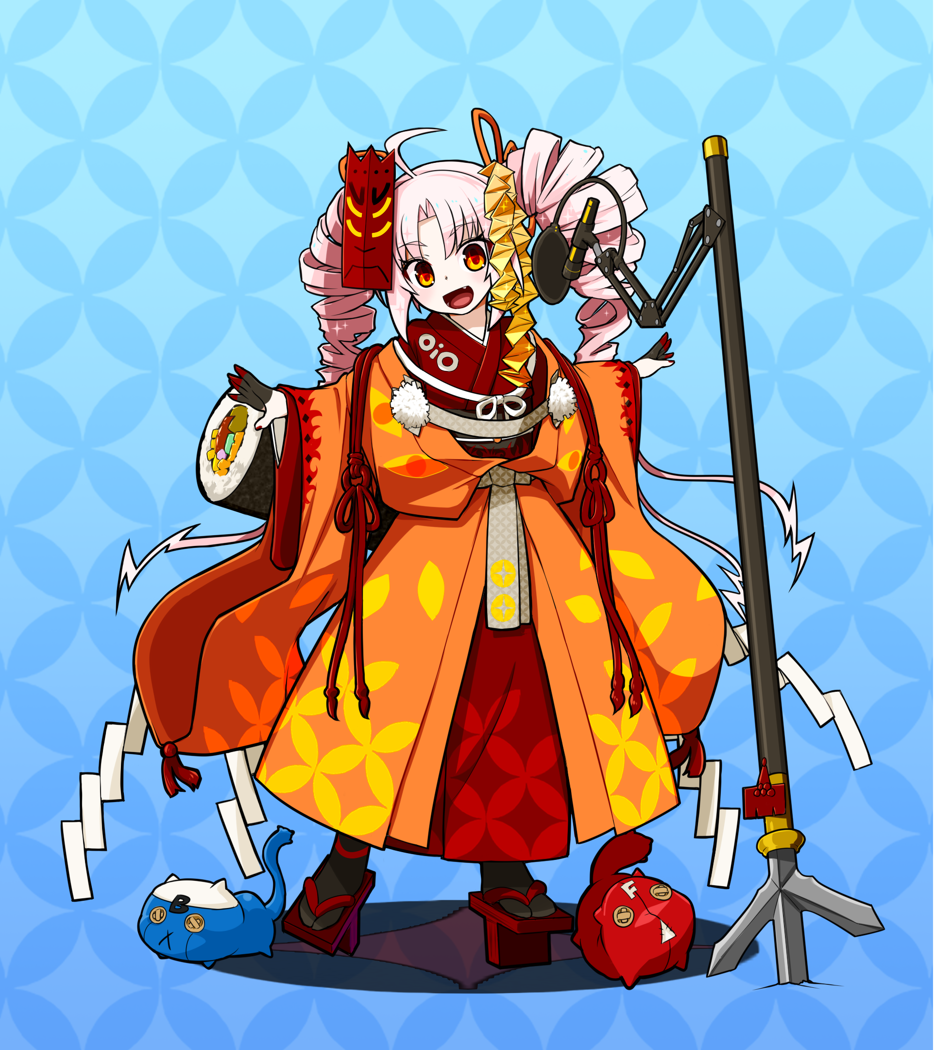 1girl ahoge commentary_request drill_hair fang food full_body geta highres japanese_clothes kimono makizushi microphone_stand open_mouth orange_eyes orange_kimono outstretched_arms peru_co pink_hair solo spread_arms stuffed_animal stuffed_toy sushi tsuina-chan twin_drills voiceroid