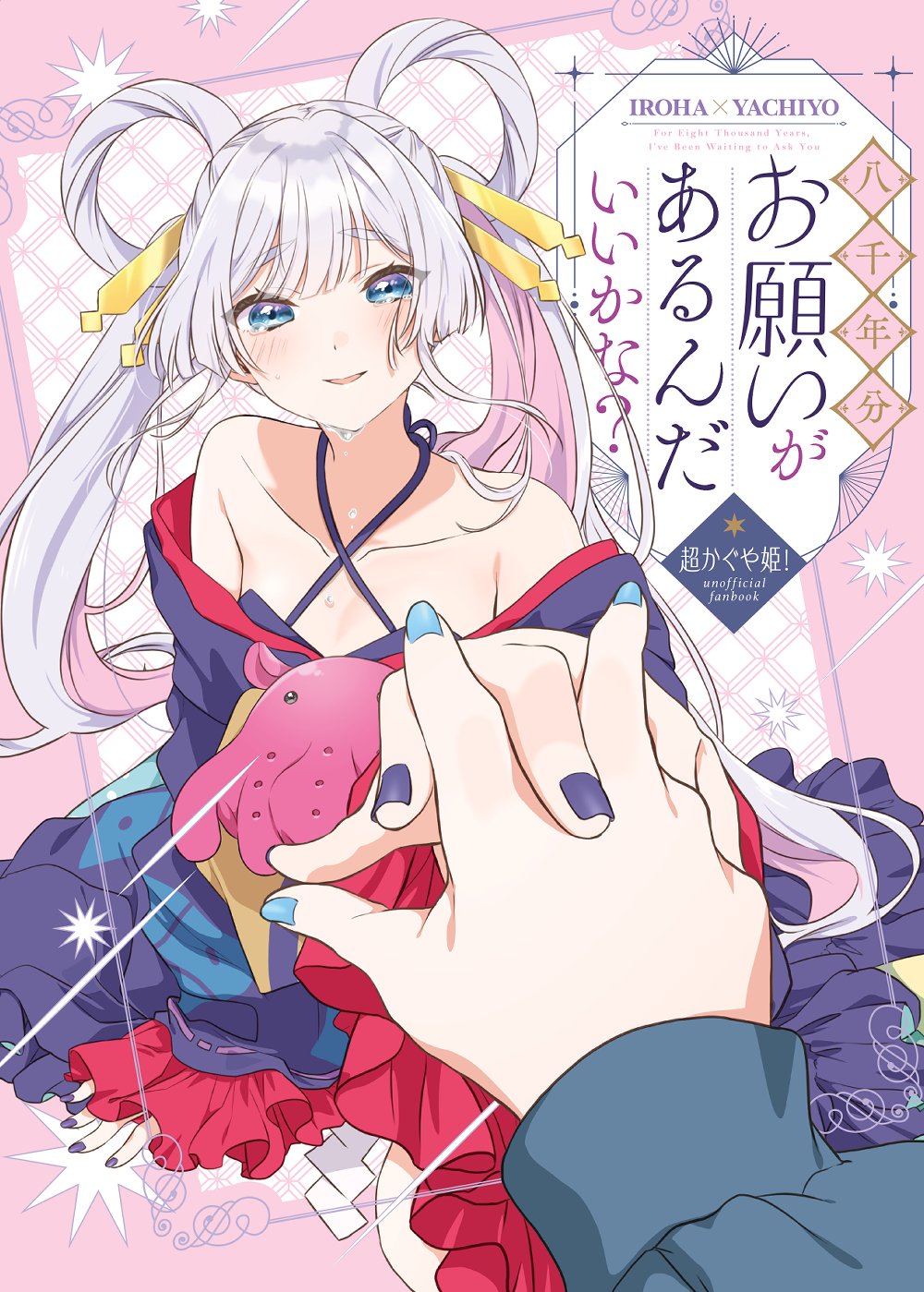 2girls armpit_crease bare_shoulders blue_eyes blue_nails breasts cho_kaguya-hime! cleavage collarbone colored_inner_hair commentary_request crying crying_with_eyes_open female_pov hair_ornament hair_rings hair_stick highres hiro_(fluffy_palette) interlocked_fingers japanese_clothes kimono long_hair long_sleeves looking_at_viewer multicolored_hair multiple_girls open_mouth pink_hair pov pov_hands purple_kimono purple_nails runami_yachiyo sakayori_iroha smile solo_focus tears thick_eyebrows twintails umbrella_octopus very_long_hair white_hair yuri