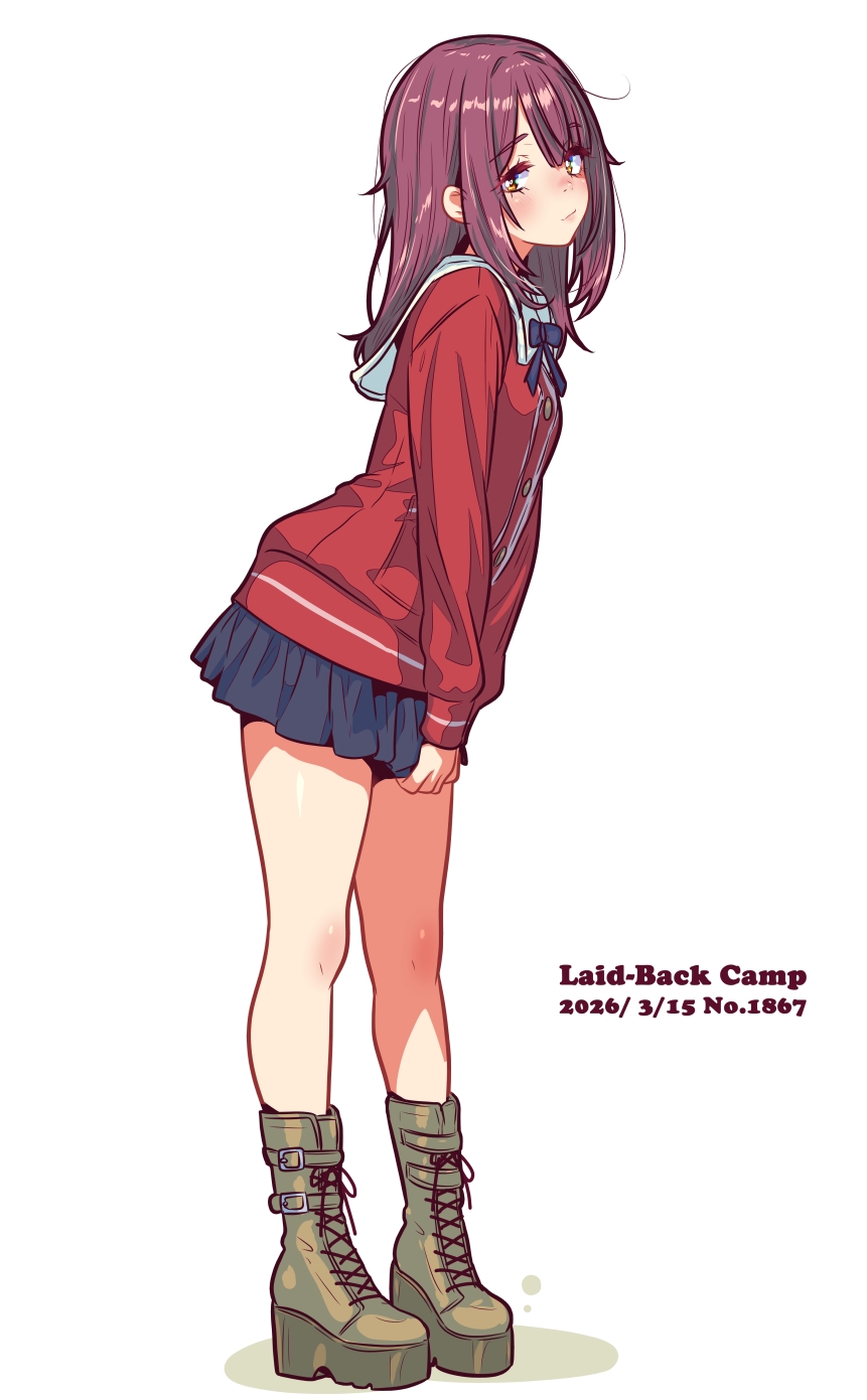 1girl :/ asymmetrical_bangs blue_bow blue_bowtie blue_skirt boots bow bowtie brown_eyes camouflage_footwear closed_mouth commentary_request copyright_name dated english_text from_side hair_intakes highres jacket jagi_(jagi_souken) leaning_forward long_hair long_sleeves looking_at_viewer messy_hair own_hands_together pleated_skirt purple_hair red_jacket red_trim sailor_collar simple_background skirt solo toki_ayano turning_head white_background white_sailor_collar white_trim yurucamp