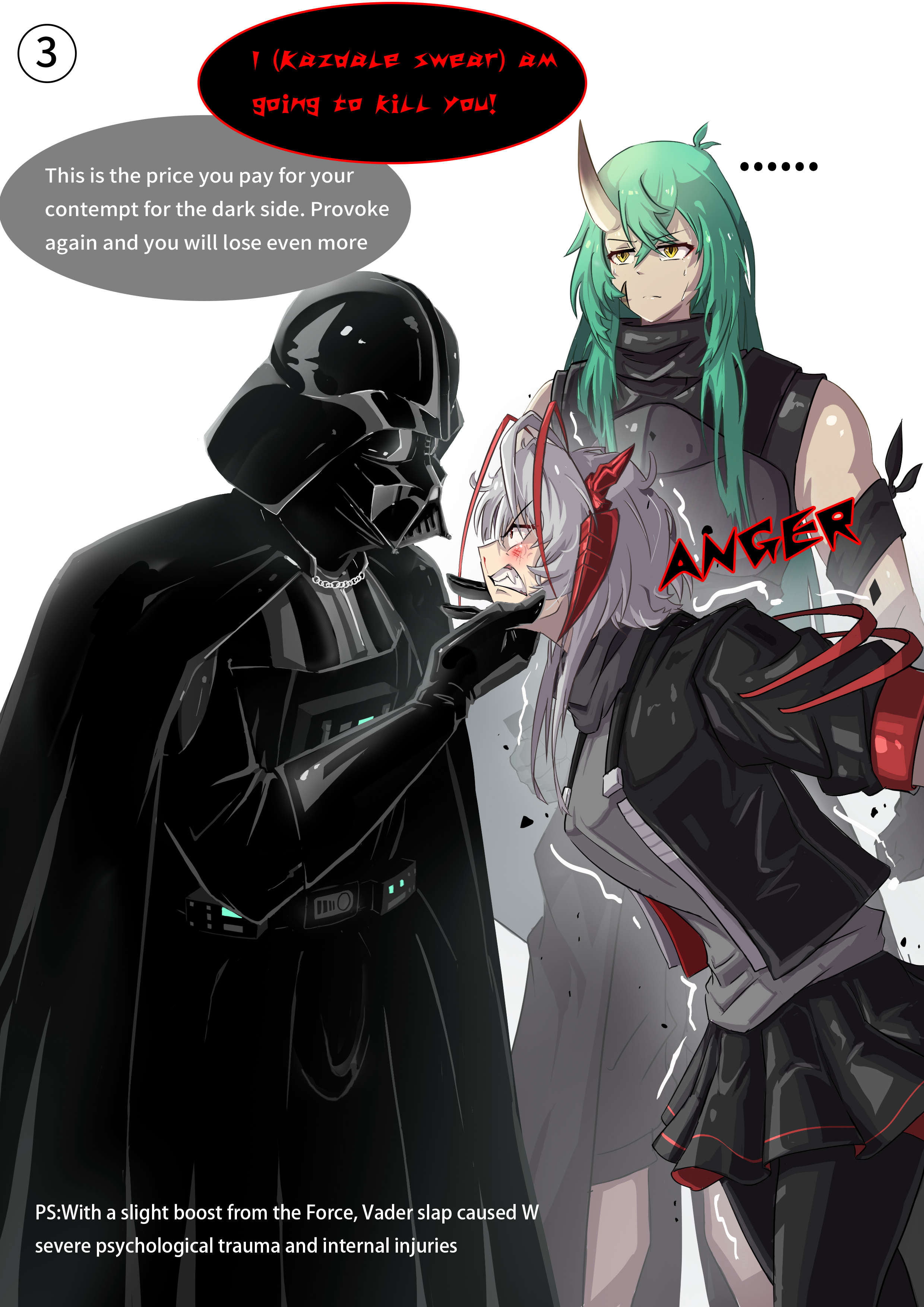 ... 1boy 2girls absurdres ahoge angry antenna_hair arknights black_cape black_gloves black_jacket black_pantyhose black_robe black_skirt blood blush cape clenched_teeth closed_mouth commentary constricted_pupils crossed_bangs crossover darth_vader english_commentary english_text facial_scar gloves green_hair grey_hair grey_shirt hair_between_eyes hansi helmet highres horns hoshiguma_(arknights) jacket long_hair long_sleeves looking_at_another miniskirt multicolored_hair multiple_girls nosebleed open_clothes open_jacket orange_hair pantyhose pleated_skirt profile robe scar scar_on_cheek scar_on_face shirt short_hair_with_long_locks simple_background single_horn skin-covered_horns skirt speech_bubble standing star_wars streaked_hair teeth trembling w_(arknights) white_background yellow_eyes