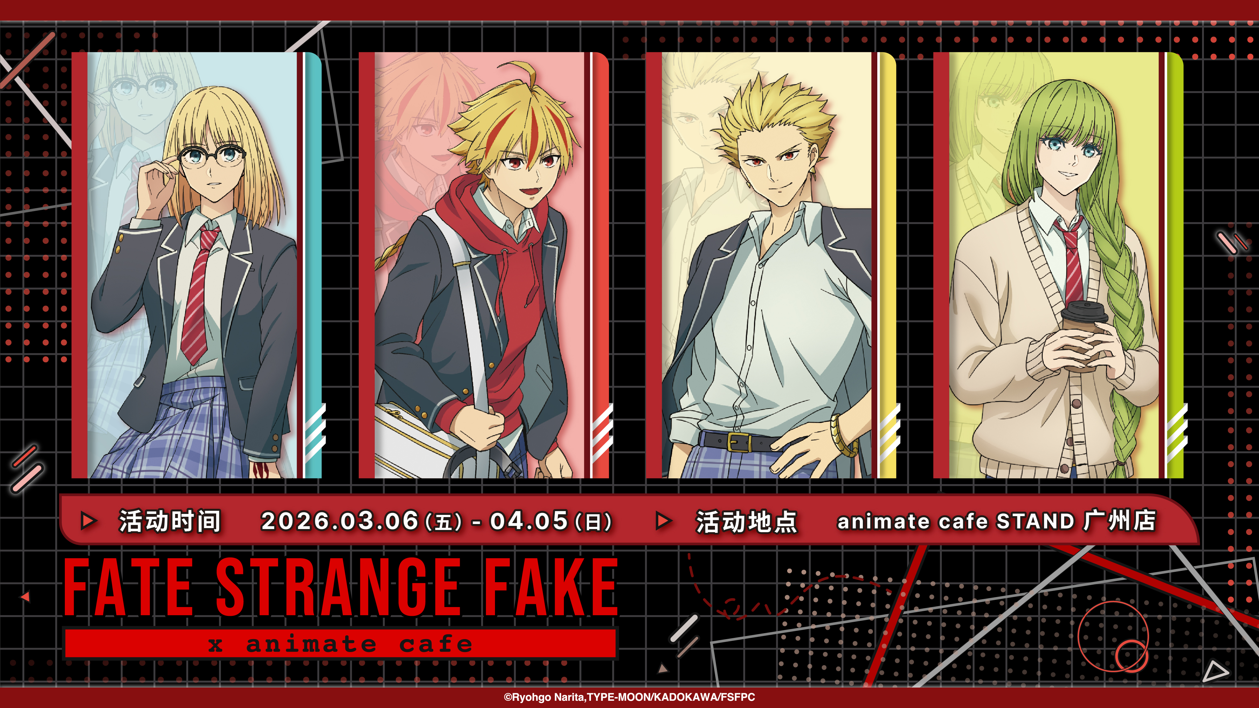 1girl 1other 2boys absurdres ahoge blonde_hair blue_eyes braid braided_ponytail collared_shirt earrings enkidu_(fate) fate/strange_fake fate_(series) gilgamesh_(fate) glasses green_eyes green_hair highres hood hoodie jacket jacket_on_shoulders jewelry long_hair looking_at_viewer medium_hair multicolored_hair multiple_boys official_art open_mouth promotional_art red_eyes red_streaks richard_i_(fate) sajou_ayaka_(fate/strange_fake) school_uniform second-party_source shirt short_hair side_braid single_braid smile streaked_hair sweater