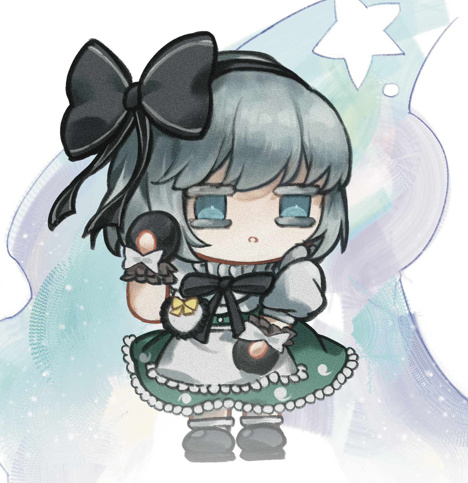 1girl apron black_bow black_gloves black_hairband black_ribbon black_shoes black_wrist_cuffs bow bright_pupils chibi chibi_only commentary_request d1nivi dress frilled_apron frilled_dress frilled_sleeves frilled_wrist_cuffs frills full_body gloves green_dress green_eyes grey_hair hair_bow hairband hand_up highres konpaku_youmu looking_at_viewer parted_lips puffy_short_sleeves puffy_sleeves ribbon shirt shoes short_hair short_sleeves socks solo touhou waist_apron white_apron white_shirt white_socks wrist_cuffs