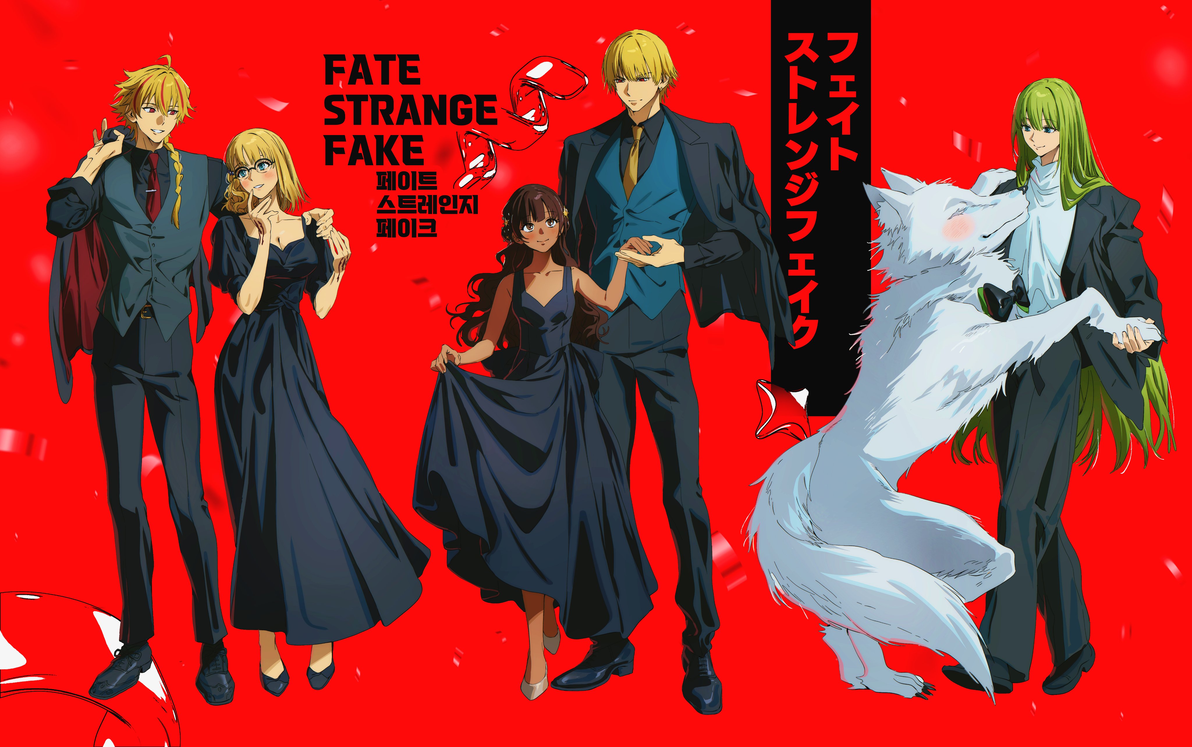 1other 2boys 2girls absurdres ahoge black_dress blonde_hair blue_eyes blush bow bowtie braid braided_ponytail command_spell commentary_request dancing dress enkidu_(fate) fate/strange_fake fate_(series) formal_clothes gilgamesh_(fate) glasses green_eyes green_hair hair_ornament highres holding_hands jacket jacket_on_shoulders korean_commentary long_hair medium_hair multicolored_hair multiple_boys multiple_girls necktie ojing_oppa_(o_b_s_00) open_mouth pants red_background red_eyes red_streaks richard_i_(fate) sajou_ayaka_(fate/strange_fake) short_hair side_braid single_braid smile streaked_hair suit tine_chelc turtleneck vest wolf wolf_(fate)