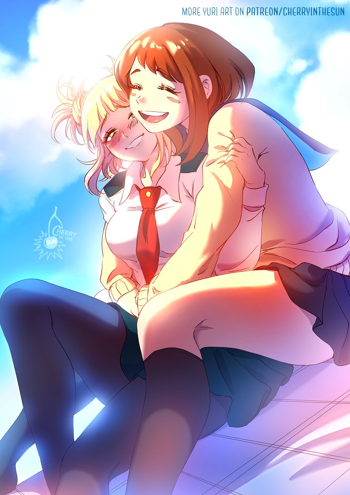 2girls artist_name black_pantyhose black_socks blonde_hair blue_sailor_collar blue_skirt blush boku_no_hero_academia breasts brown_hair cherry_in_the_sun closed_eyes commentary cosplay double_bun english_commentary green_skirt hair_bun hug hug_from_behind large_breasts looking_at_another medium_hair multiple_girls necktie open_mouth pantyhose pleated_skirt red_necktie sailor_collar school_uniform signature sitting skirt socks sweat sweater toga_himiko toga_himiko_(cosplay) uraraka_ochaco_(cosplay) uraraka_ochako yellow_eyes yellow_sweater yuri
