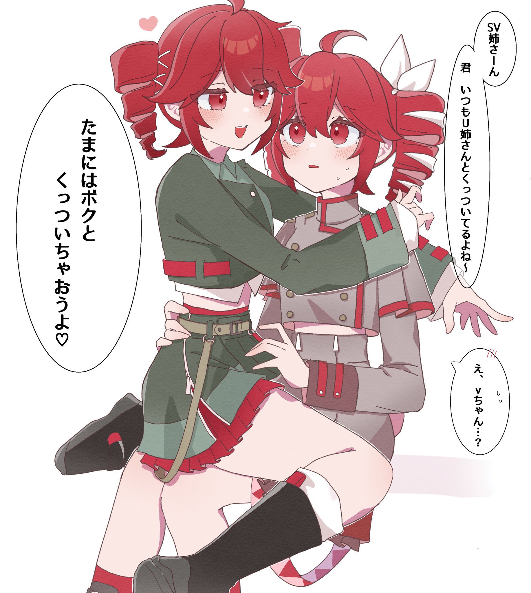 2girls :d \||/ ahoge arm_around_shoulder bare_legs belt black_boots blush boots bow brown_belt buttons collared_jacket crop_top cropped_jacket double-breasted double-parted_bangs eye_contact eyes_visible_through_hair face-to-face feet_out_of_frame film_grain full_body grey_jacket grey_skirt hair_between_eyes hair_bow hand_on_another's_hip hand_on_another's_shoulder hashtag-only_commentary heart high-waist_skirt highres hug jacket jitome kasane_teto kasane_teto_(sv) kasane_teto_(voicepeak) knee_boots kneehighs layered_clothes layered_sleeves long_sleeves looking_at_another midriff miniskirt multiple_girls open_mouth parted_lips petticoat red_eyes red_hair red_socks red_trim shadow shirt sidelocks simple_background sitting sitting_on_lap sitting_on_person skirt smile socks speech_bubble sweat synthesizer_v tareme teeth translation_request turtleneck turtleneck_jacket upper_teeth_only utau uwa_illust_v16v voicepeak white_background white_bow white_shirt white_socks yuri