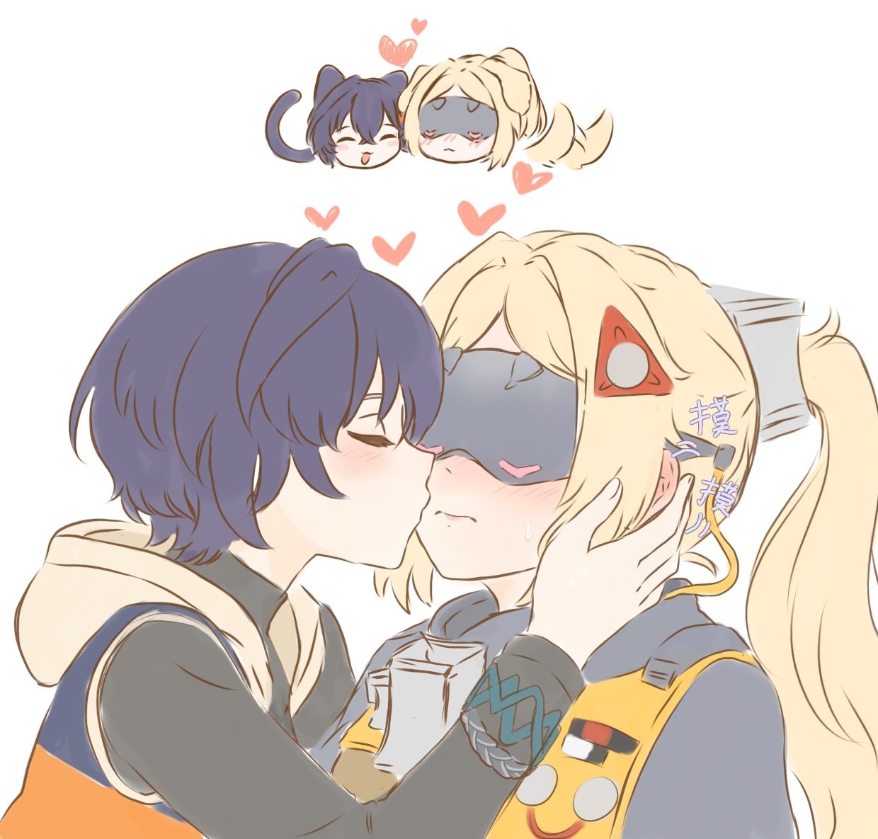 2girls animal_ears belle_(zenless_zone_zero) blindfold blue_hair blush cat_ears closed_eyes closed_mouth commentary dog_ears french_kiss heart kiss kissing_cheek long_hair longxinxuesui multiple_girls open_mouth ponytail shirt short_hair smile trigger_(zenless_zone_zero) untranslatable_commentary white_background white_shirt yuri zenless_zone_zero