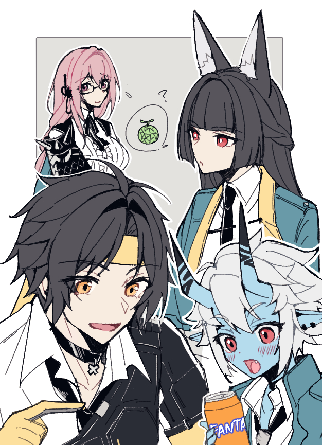 1boy 3girls animal_ears asaba_harumasa black_hair closed_mouth commentary_request fox_ears fox_girl glasses hoshimi_miyabi long_hair multiple_girls oftongasuki3 open_mouth pink_eyes pink_hair red_eyes shirt smile soukaku_(zenless_zone_zero) tsukishiro_yanagi white_hair zenless_zone_zero