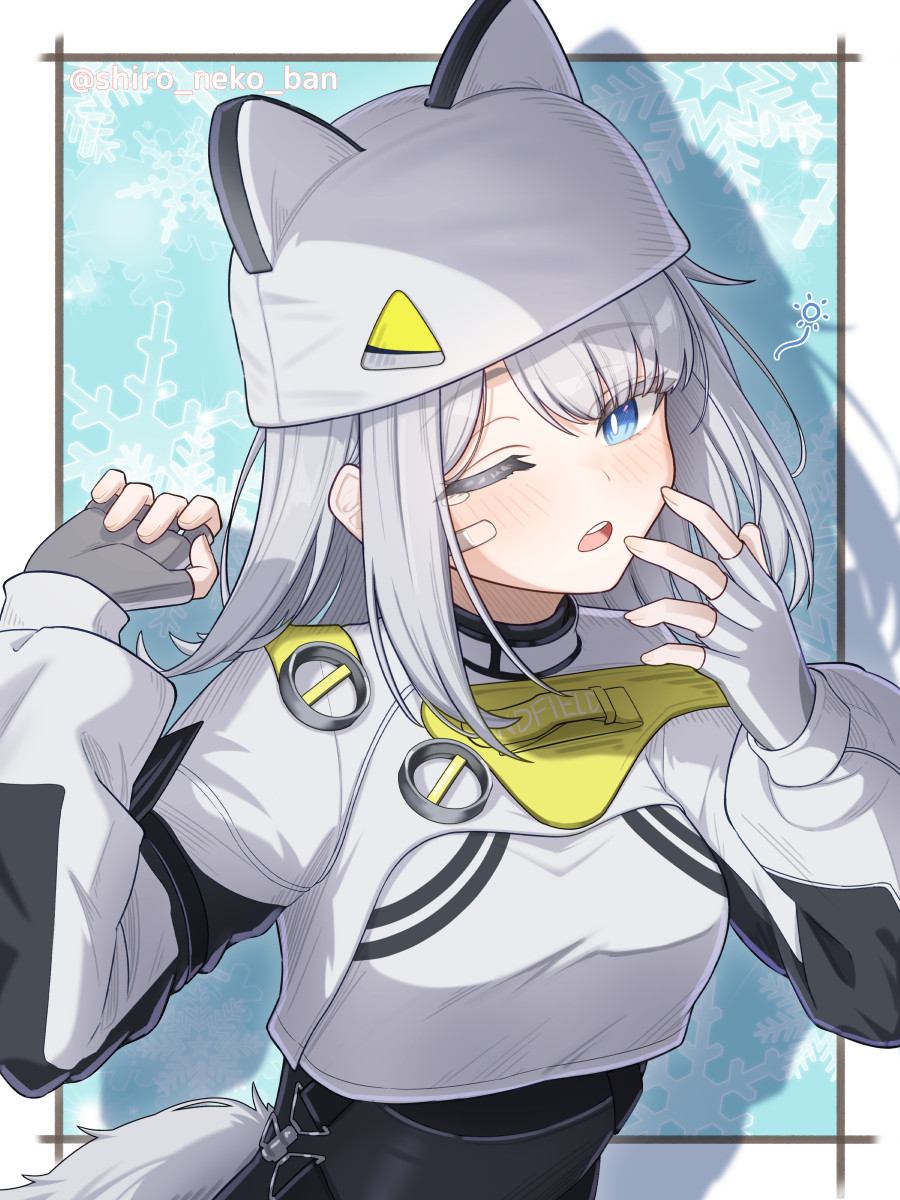1girl animal_ears arknights arknights:_endfield bandaid bandaid_on_face blue_eyes cat_ears cat_girl cat_tail commentary estella_(arknights) fingerless_gloves gloves grey_gloves grey_hair hat highres long_hair looking_at_viewer medium_hair one_eye_closed open_mouth shironekoban sidelocks solo tail white_hat yawning