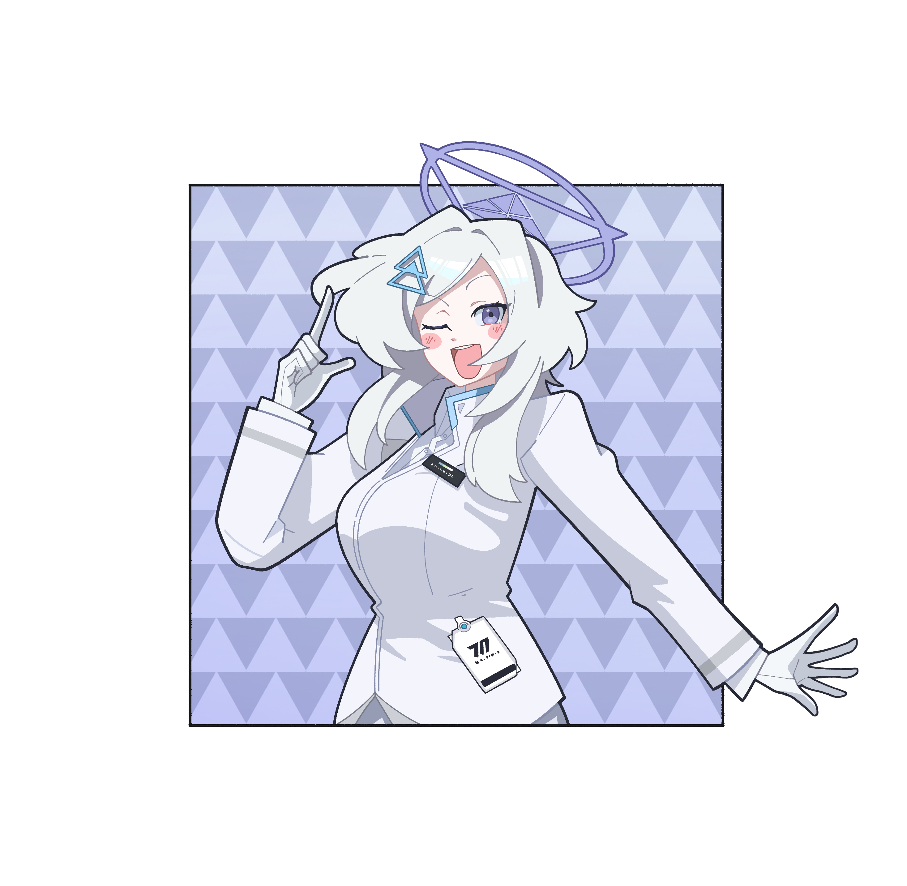 1girl absurdres blue_archive breasts commentary_request gloves hair_ornament halo highres large_breasts long_hair long_sleeves mirai_(blue_archive) one_eye_closed open_mouth purple_eyes purple_halo round_teeth smile solo teeth toucho3691 triangle_hair_ornament upper_teeth_only white_gloves white_hair