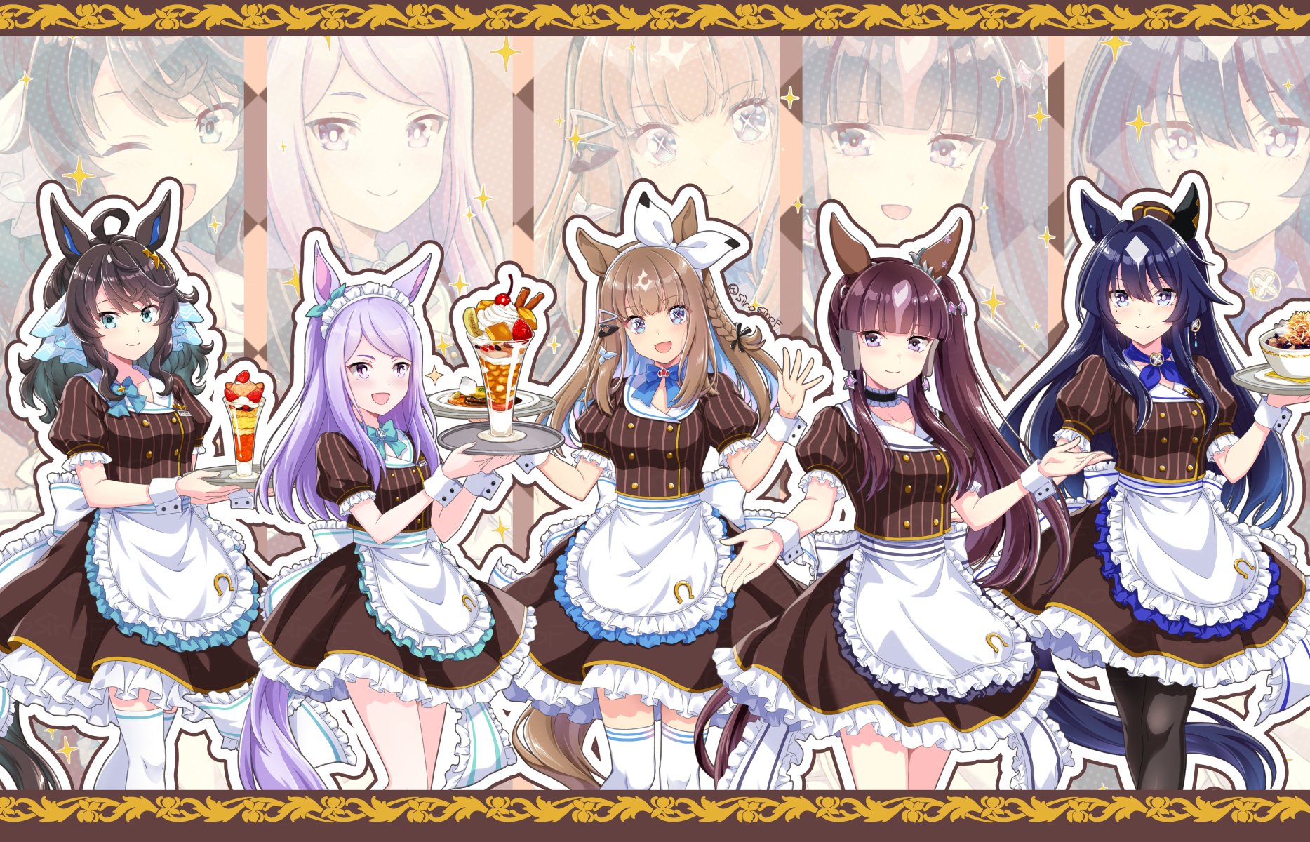 5girls ahoge almond_eye_(umamusume) alternate_costume black_hair blue_eyes blush braid braided_sidelocks breasts brown_hair collarbone commentary_request commission daring_tact_(umamusume) food hair_between_eyes hair_ornament highres long_hair lucky_lilac_(umamusume) medium_breasts mejiro_mcqueen_(umamusume) mole mole_under_eye multiple_girls open_mouth parfait plate purple_eyes ribbon shinohara_shinome sidelocks skeb_commission smile thighhighs umamusume verxina_(umamusume)