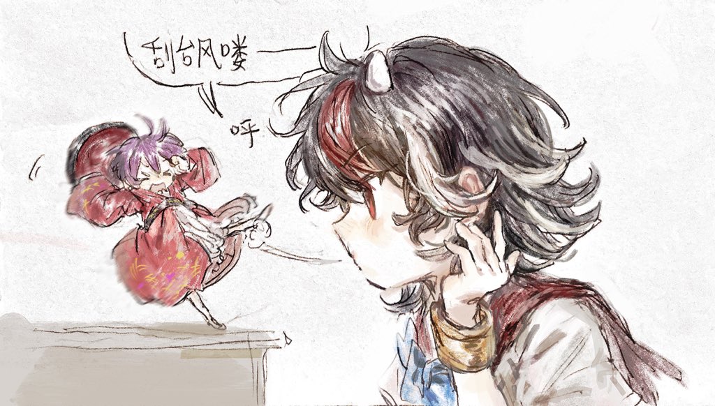 2girls black_hair blowing blue_bow blue_bowtie bow bowl bowl_hat bowtie bracelet chinese_text closed_eyes commentary falling filia_(sonzione807560) frown full_body grey_background hand_up hashtag-only_commentary hat horns japanese_clothes jewelry kijin_seija kimono leg_up looking_ahead looking_at_another medium_hair mini_person minigirl multicolored_hair multiple_girls open_mouth puff_of_air purple_hair red_eyes red_kimono red_streaks shirt short_sleeves small_horns streaked_hair sukuna_shinmyoumaru touhou translation_request upper_body v-shaped_eyebrows white_horns white_shirt white_streaks