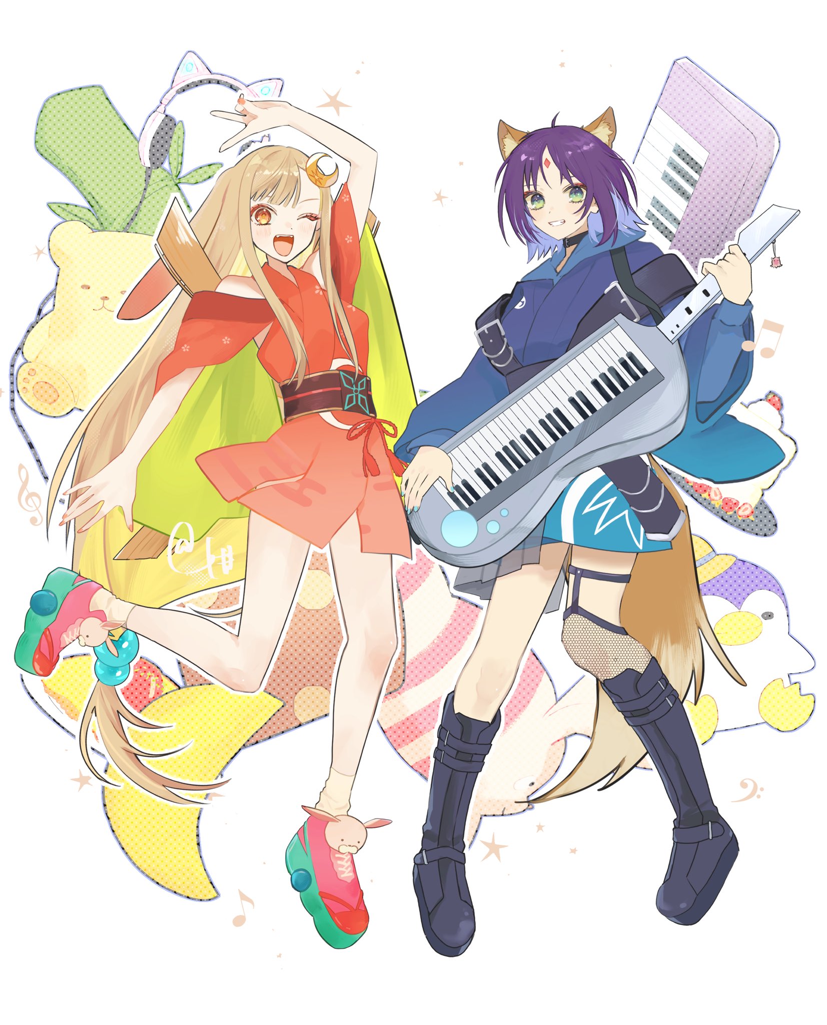 2girls ahoge animal_ear_headphones animal_ears arm_up black_boots blonde_hair blue_hoodie boots cat_ear_headphones cat_ears cho_kaguya-hime! crescent crescent_hair_ornament fake_animal_ears forehead_jewel fox_ears full_body green_eyes hair_ornament hashtag-only_commentary headphones highres holding holding_instrument hood hoodie instrument japanese_clothes kaguya_(cho_kaguya-hime!) keyboard_(instrument) keytar kimono knee_boots long_hair looking_at_viewer lop_rabbit_ears multiple_girls one_eye_closed open_mouth pink_shoes purple_hair rabbit_ears red_kimono sakayori_iroha shoes short_hair smile standing stuffed_animal stuffed_penguin stuffed_toy teddy_bear urtk07 v white_background