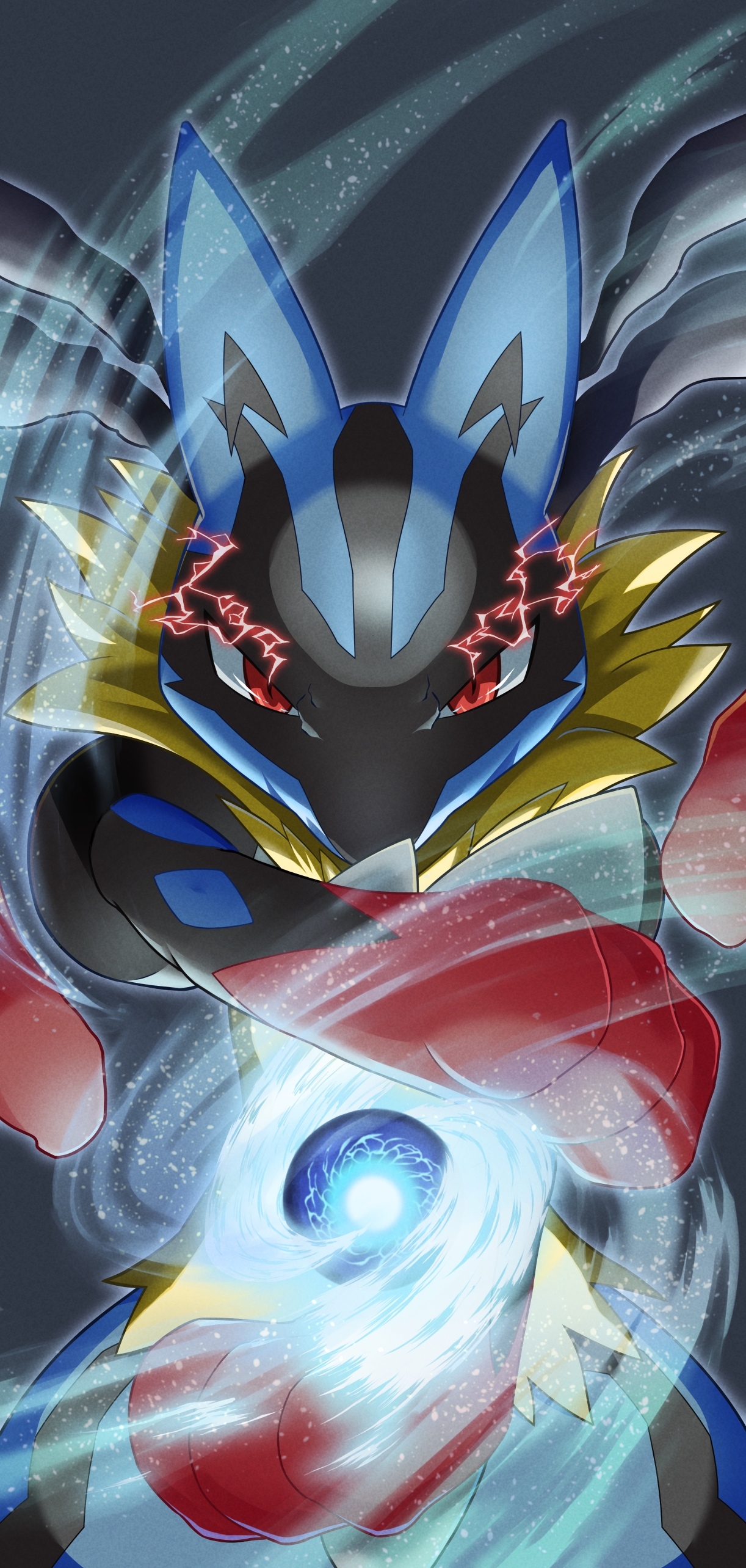 1other absurdres aura_sphere_(pokemon) black_fur blue_fur cable commentary_request furry gen_4_pokemon highres looking_at_viewer lucario mega_lucario mega_pokemon multicolored_fur nikumarupokemon nintendo other_focus pokemon pokemon_(creature) pokemon_focus red_eyes red_fur solo spikes yellow_fur