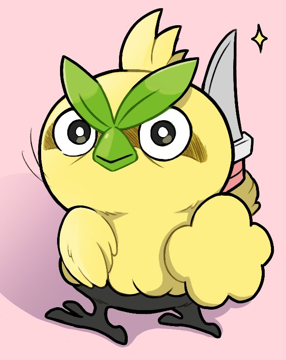 1other arijuno beak bird bird_tail bird_wings browt closed_mouth commentary english_commentary from_behind hand_wings holding holding_knife knife looking_at_viewer nintendo no_humans pink_background pokemon pokemon_(creature) pokemon_winds_and_waves smile sparkle tail talons wings