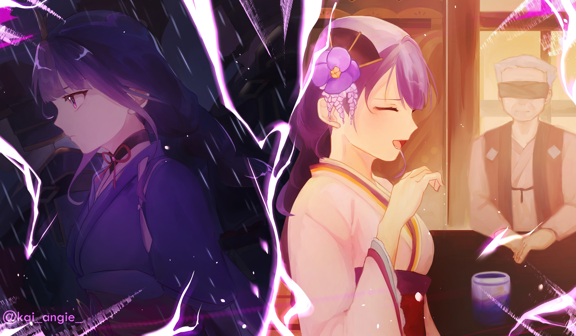 1boy 2girls alternate_costume artist_name blindfold commentary cup electricity english_commentary from_side genshin_impact hair_ornament highres indoors japanese_clothes kai_angie kimono long_sleeves makoto_(genshin_impact) multiple_girls old old_man outdoors pink_kimono purple_eyes purple_hair purple_kimono raiden_shogun rain red_sash sash siblings sisters twins upper_body wide_sleeves