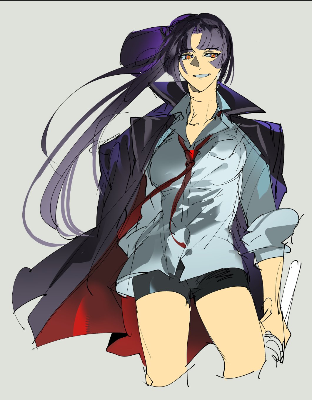 1girl black_hair black_shorts cloak fate/grand_order fate_(series) hair_between_eyes hair_bun highres holding holding_weapon long_hair looking_at_viewer multicolored_eyes necktie red_necktie shirt shorts simple_background sketch smile taira_no_kagekiyo_(fate) thighs ushiwakamaru_(fate) weapon white_background white_shirt zzapung
