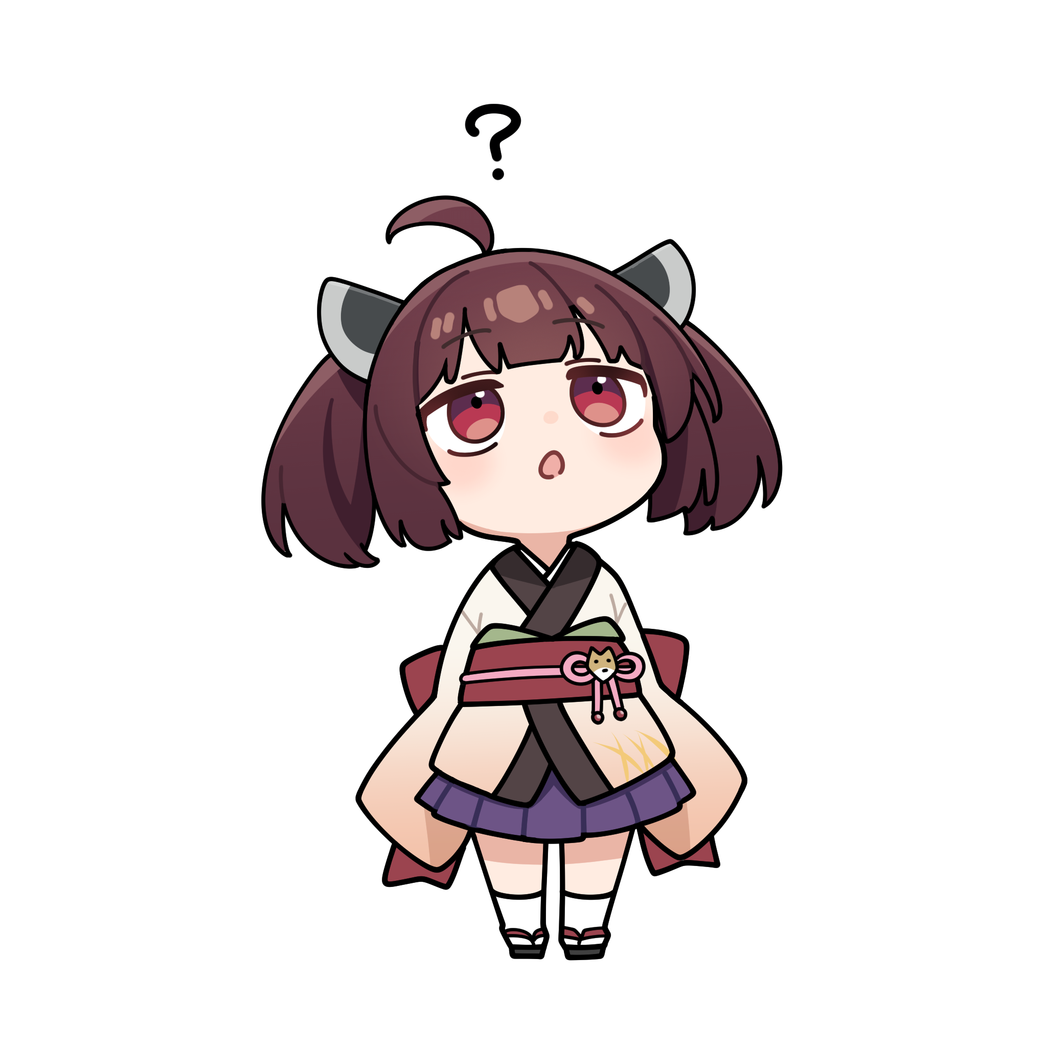 1girl :o ? ahoge black_sandals blunt_bangs brown_hair chibi chibi_only commentary_request full_body headgear highres japanese_clothes kimono long_sleeves looking_up obi open_mouth pleated_skirt purple_skirt red_eyes red_sash sandals sash shiguren_39 short_hair simple_background skirt sleeves_past_fingers sleeves_past_wrists socks solo standing touhoku_kiritan transparent_background voiceroid white_kimono white_socks wide_sleeves