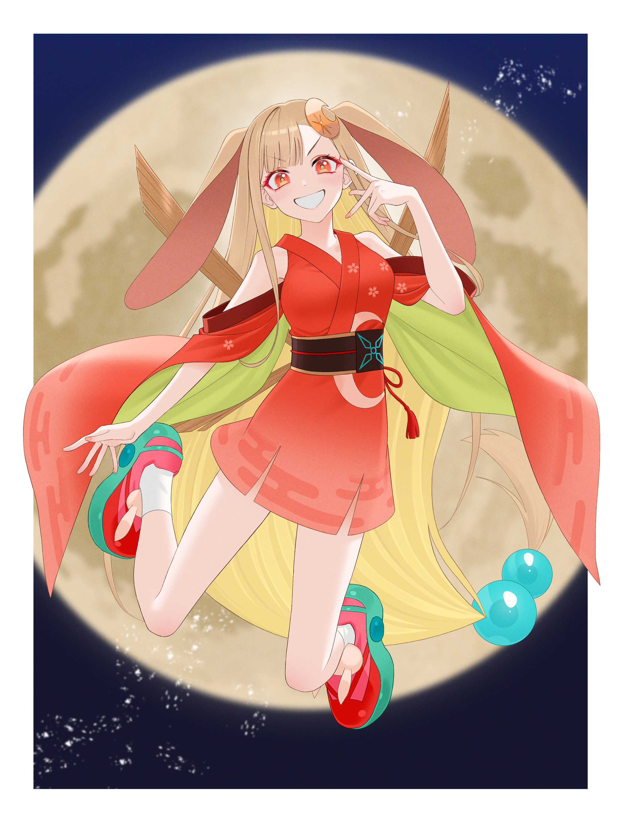 1girl absurdres animal_ears armor blonde_hair blurry blurry_background border breasts brown_eyes brown_hair cho_kaguya-hime! colored_inner_hair commentary_request crescent crescent_hair_ornament egasumi full_moon hair_ornament highres hinoyama_ena japanese_clothes kaguya_(cho_kaguya-hime!) kimono logo long_hair looking_at_viewer low-tied_long_hair medium_breasts moon multicolored_hair open_mouth outside_border rabbit_ears rabbit_girl red_kimono red_shoes shoes shoulder_armor socks solo white_border white_socks