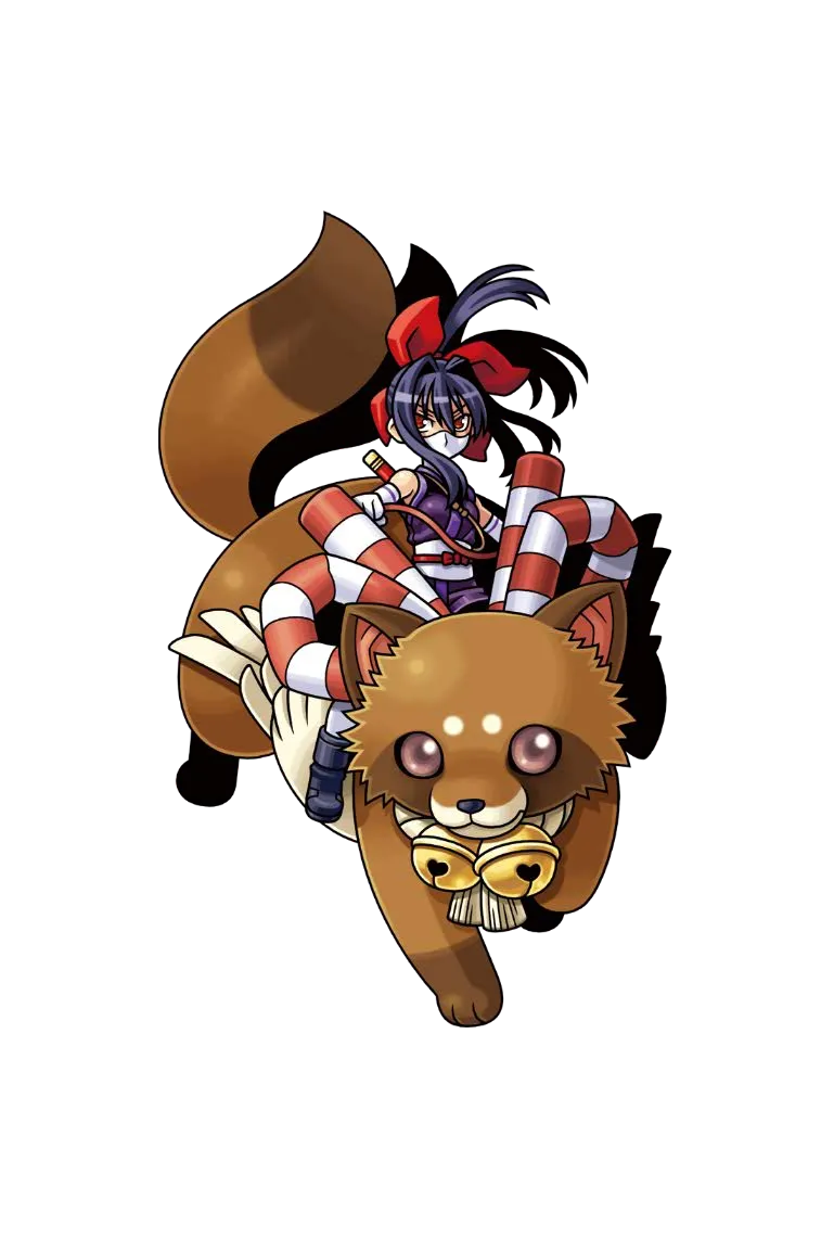 1girl ankle_boots black_boots boots brown_tail elbow_gloves floating_hair gloves hair_between_eyes hair_ribbon harakawa_mitsuhiro high_ponytail holding holding_rope japanese_clothes kimono kirikaze_(shinrabanshou) long_hair mask mouth_mask ninja obi official_art ponytail purple_hair purple_kimono red_eyes red_ribbon ribbon riding riding_animal rope sash sheath shinrabanshou sleeveless sleeveless_kimono tanuki third-party_source transparent_background weapon weapon_on_back white_gloves yuuyami_no_mikazuki