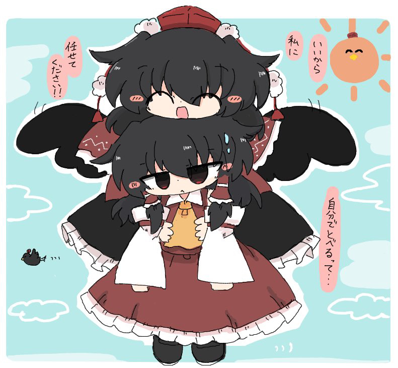 2girls ascot bird bird_wings black_skirt black_wings blue_sky blush_stickers bow brown_hair closed_eyes commentary_request day detached_sleeves facing_viewer flying frilled_bow frilled_hair_tubes frilled_skirt frills hair_bow hair_tubes hakurei_reimu hat kuuinusuki long_hair looking_at_viewer multiple_girls pom_pom_(clothes) red_bow red_eyes red_hat red_skirt shameimaru_aya skirt skirt_set sky speech_bubble sun tokin_hat touhou translation_request wings yellow_ascot