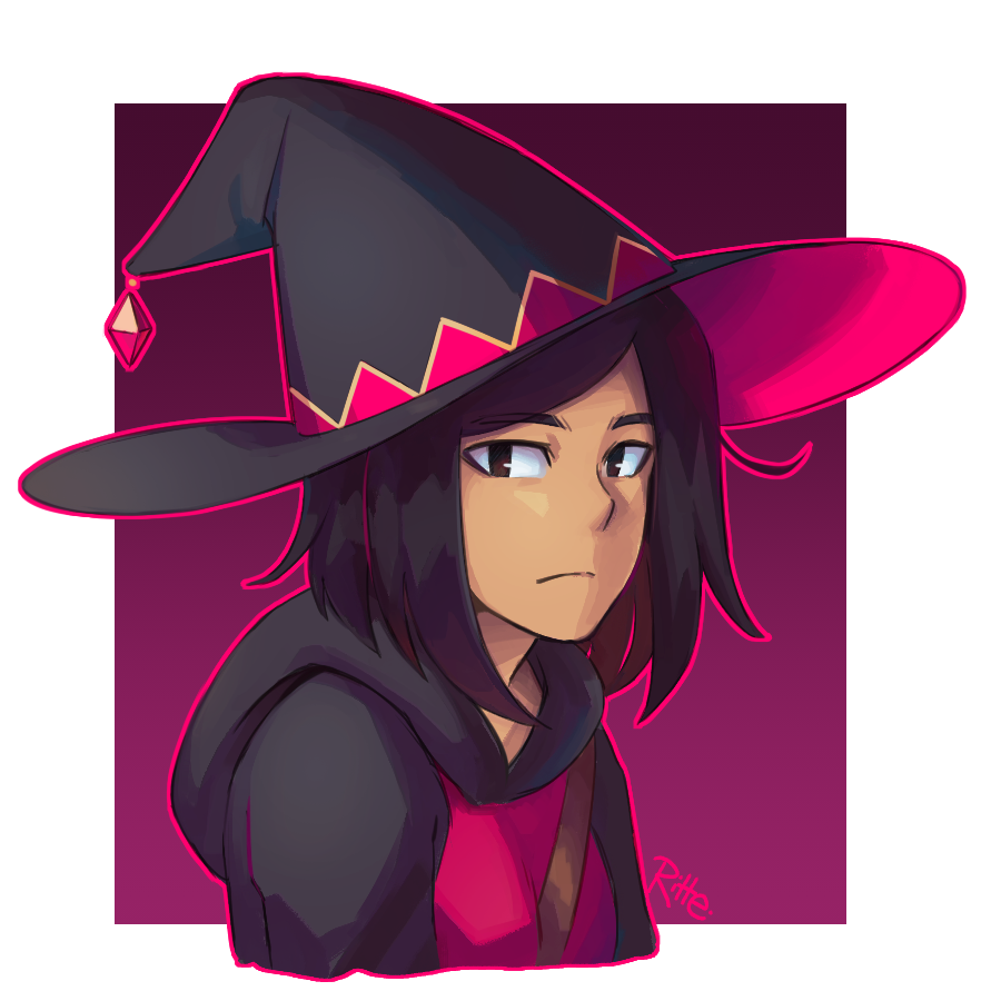 1girl artist_name black_coat black_eyes black_hair black_hat border closed_mouth coat commentary english_commentary frown gradient_background hat hood hooded_coat looking_at_viewer lunacid medium_hair nose original outline outside_border player_character_(lunacid) portrait purple_background purple_outline ritterdoodles solo white_border witch_hat