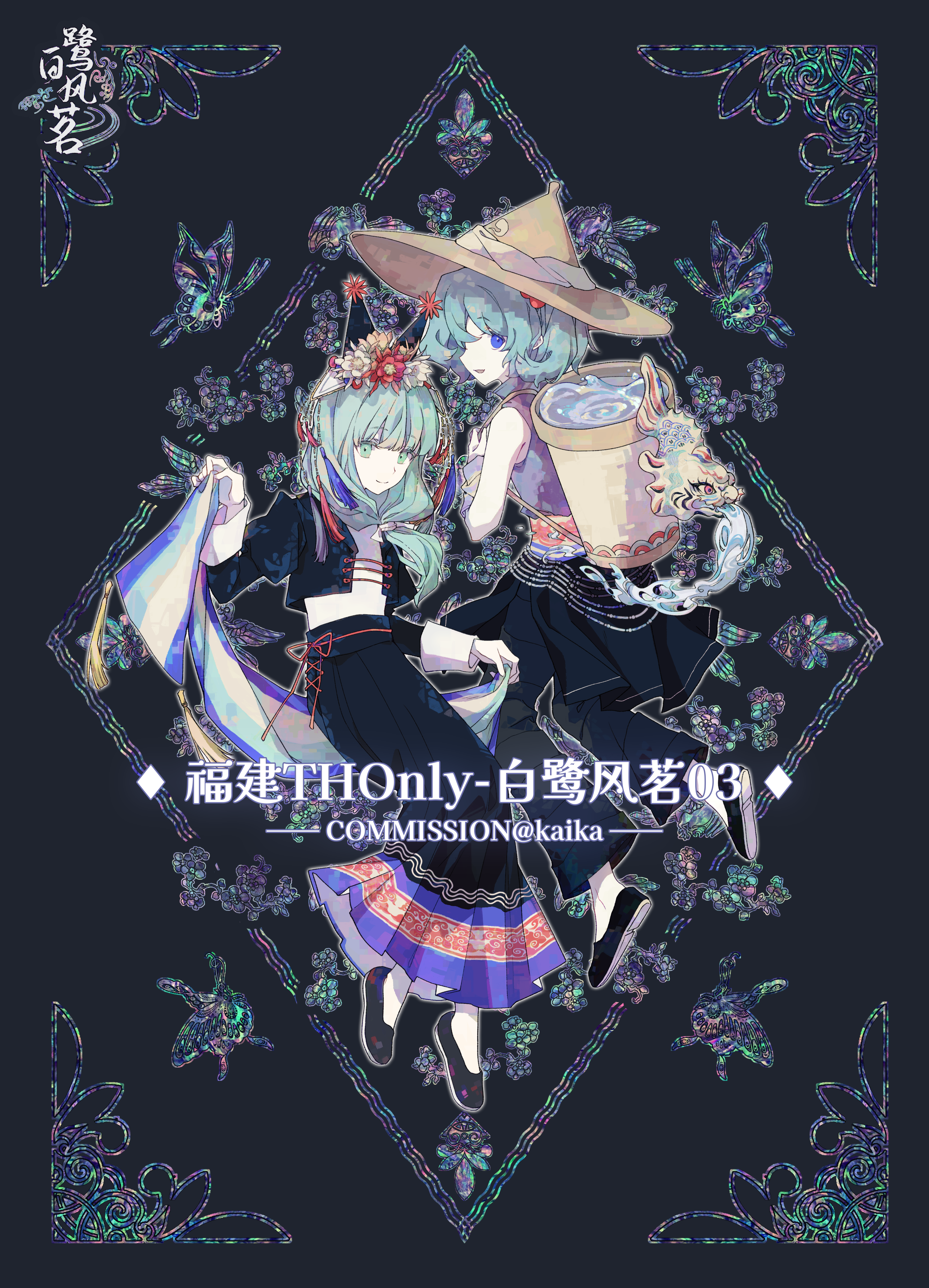 2girls absurdres black_pants black_shoes black_skirt black_vest blue_eyes blue_hair brown_hat chinese_clothes chinese_commentary chinese_text commentary_request commission flower flower_on_head green_eyes green_hair hat highres kagiyama_hina kawashiro_nitori multiple_girls pants shoes skirt smile touhou vest watermark zhihuaiqiang