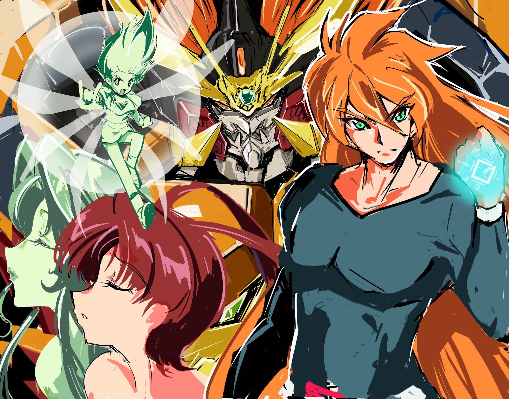 1girl antenna_hair armor blue_eyes brown_hair commentary_request full_armor gattai genesic_gaogaigar highres kazuu long_hair mecha red_hair robot science_fiction shishiou_gai super_robot utsugi_mikoto v-fin yuusha_ou_gaogaigar yuusha_ou_gaogaigar_final yuusha_series