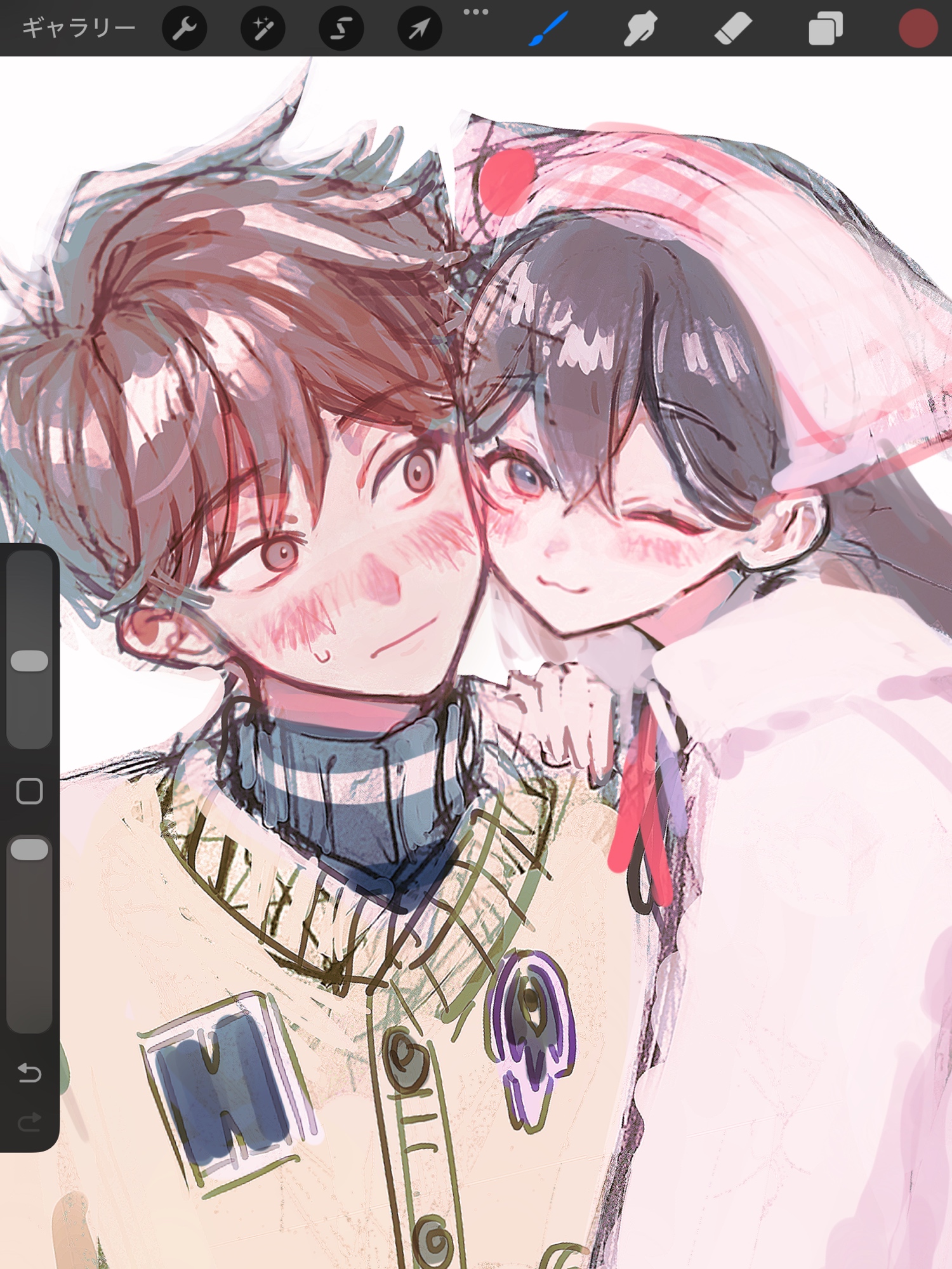 1boy 1girl :3 alternate_eye_color art_program_in_frame black_eyes black_hair blush brown_cardigan brown_eyes brown_hair cardigan closed_mouth commentary_request double-parted_bangs hair_between_eyes headscarf hero_(birthday)_(omori) hero_(faraway)_(omori) hero_(omori) highres jacket long_hair looking_at_another looking_at_viewer mari_(birthday)_(omori) mari_(faraway)_(omori) mari_(omori) official_alternate_costume omori one_eye_closed ow12714 short_hair simple_background sketch smile sweatdrop sweater turtleneck turtleneck_sweater white_background white_headscarf white_jacket