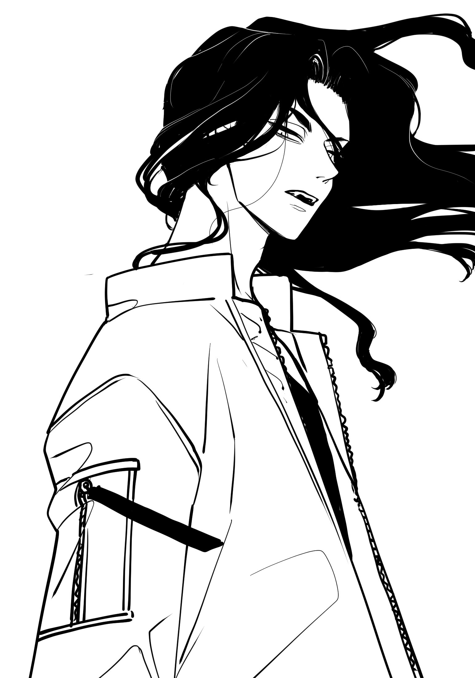 1boy baji_keisuke commentary_request fangs han_dodo16577 highres korean_commentary long_hair long_sleeves looking_at_viewer male_focus monochrome parted_lips puffy_long_sleeves puffy_sleeves simple_background sketch solo tokyo_revengers upper_body white_background