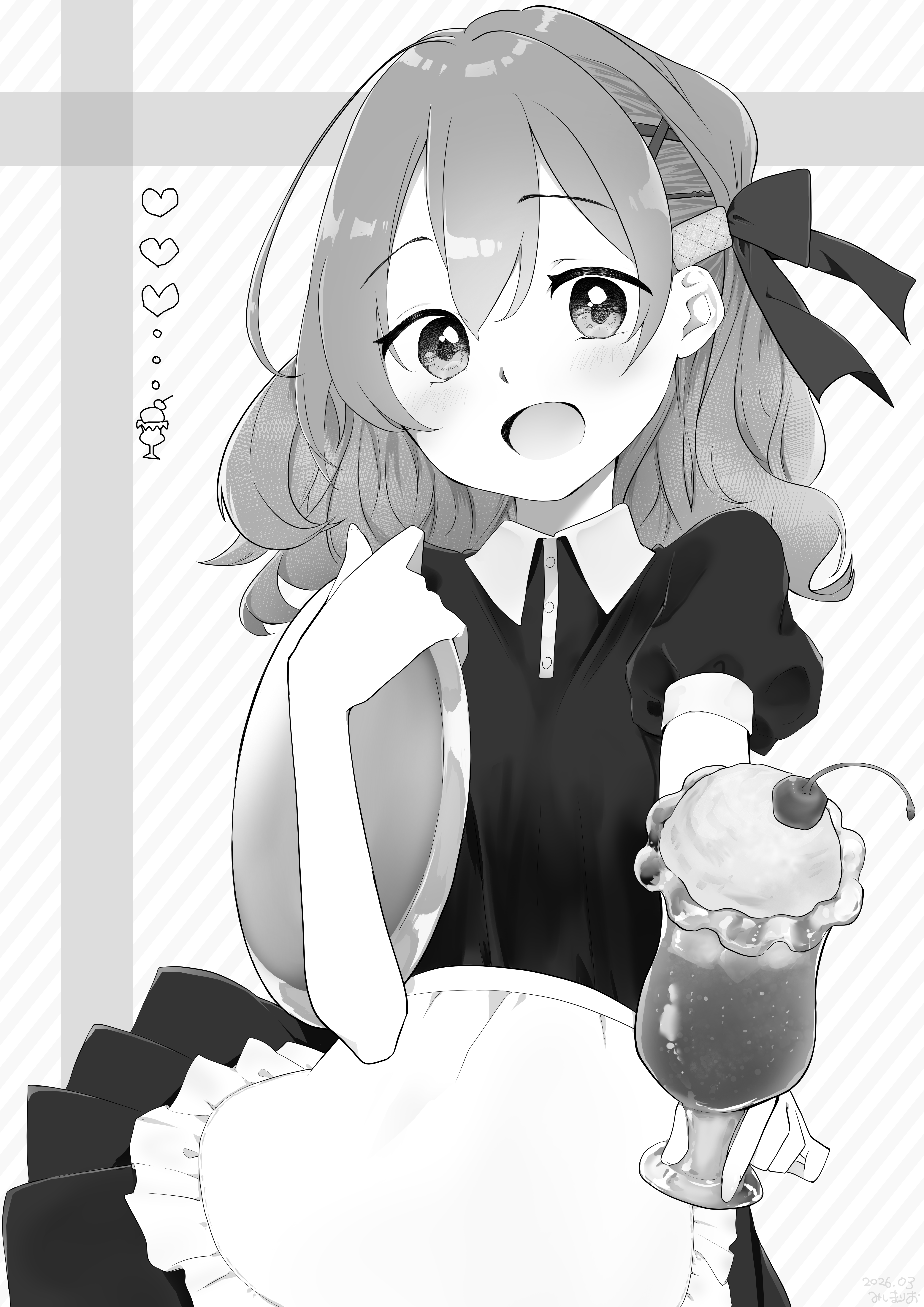1girl :d absurdres apron bow collared_shirt commentary_request cup diagonal-striped_background food frilled_apron frills greyscale hair_between_eyes hair_bow hair_ornament highres holding holding_cup holding_tray ice_cream ice_cream_float long_hair mishima_ryo monochrome open_mouth original pleated_skirt polo_shirt puffy_short_sleeves puffy_sleeves shirt short_sleeves skirt smile solo striped_background tray waist_apron x_hair_ornament