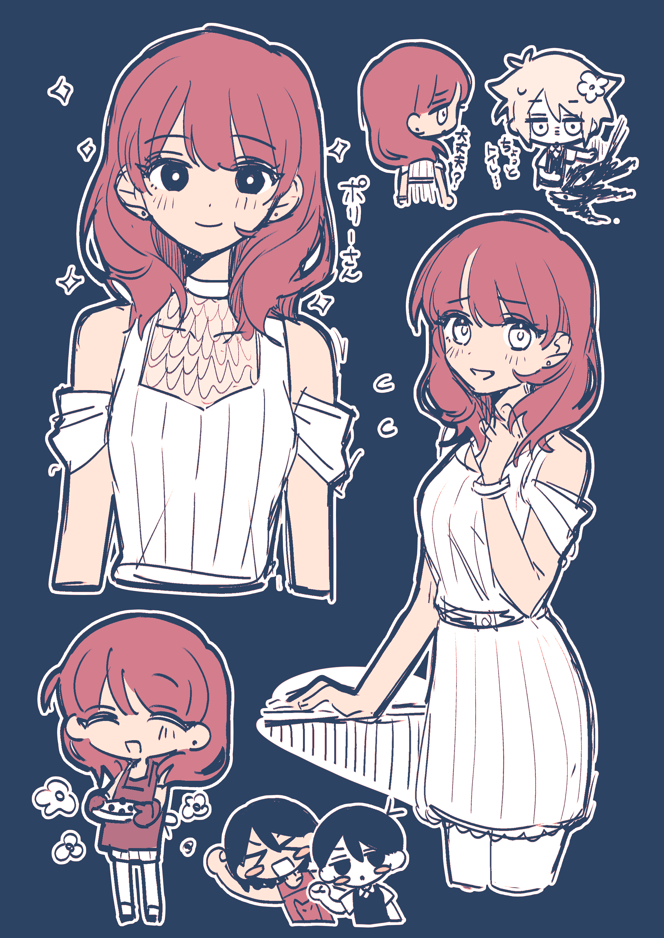 1girl 3boys absurdres antenna_hair apron basil_(faraway)_(omori) basil_(omori) black_background black_eyes blonde_hair blush blush_stickers bracelet bright_pupils brown_hair chibi closed_eyes closed_mouth collared_shirt commentary_request ear_piercing flower flying_sweatdrops hair_flower hair_ornament highres jewelry kel_(faraway)_(omori) kel_(omori) komekopan_720 looking_at_viewer medium_hair multiple_boys omori open_mouth outline piercing polly_(omori) shirt short_hair short_sleeves sidelocks simple_background sketch smile something_(omori) sunny_(omori) sweater_vest translation_request white_eyes white_outline white_pupils
