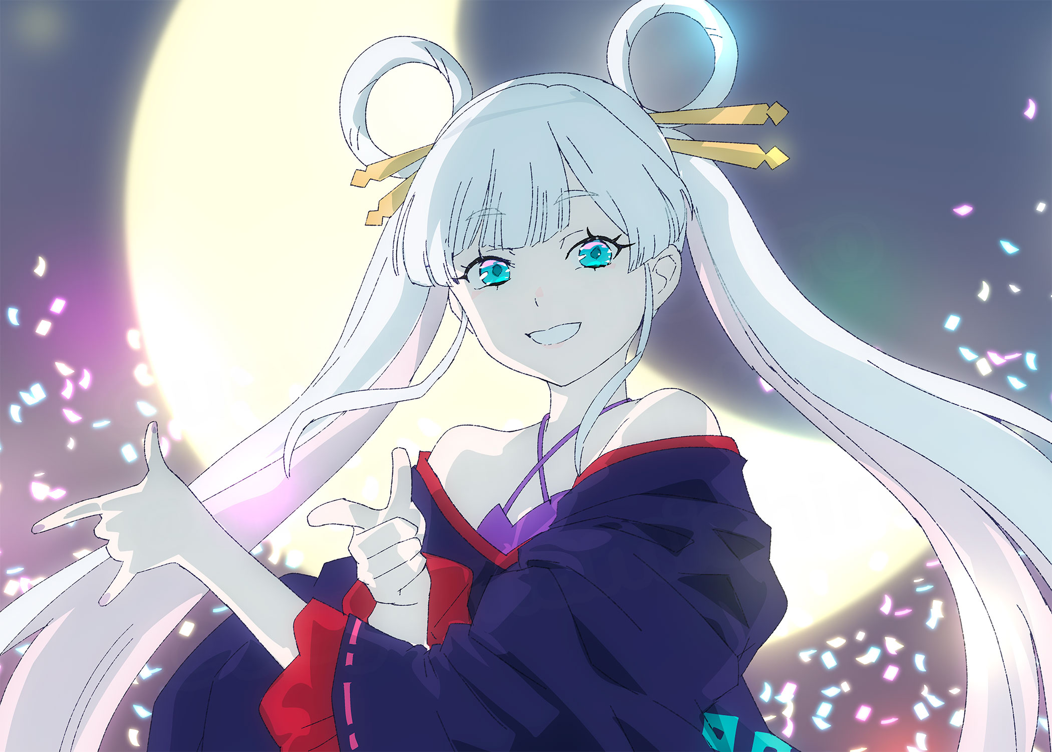 aqua_eyes bishoujo_senshi_sailor_moon check_commentary cho_kaguya-hime! commentary_request crescent crossover glowing glowing_motes hair_ornament hair_rings hair_stick high_contrast highres japanese_clothes kimono lips looking_at_viewer pointing purple_kimono runami_yachiyo tsuki_ni_kawatte_oshioki_yo twintails ueyama_michirou white_hair