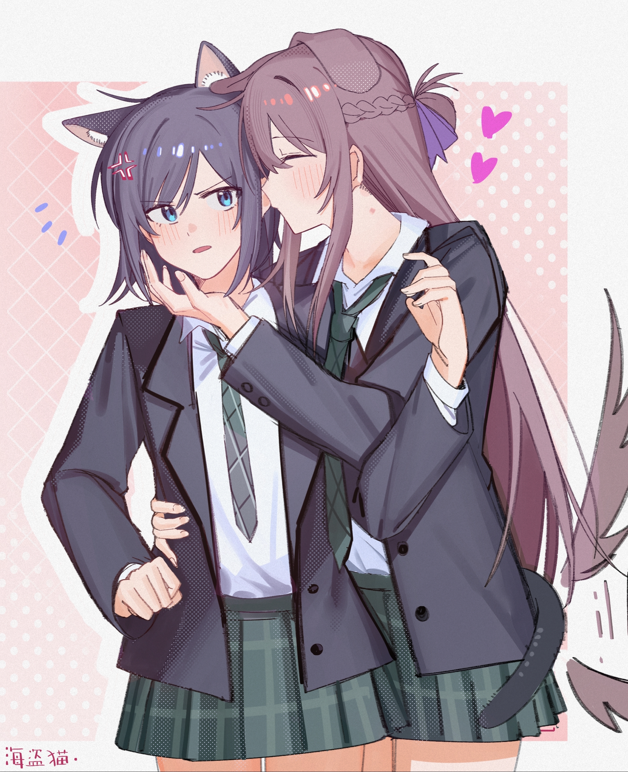 2girls absurdres anger_vein animal_ears black_jacket blue_eyes blush braid brown_hair cat_ears cat_girl cat_tail chinese_commentary closed_eyes commentary_request dog_ears dog_girl dog_tail green_necktie green_skirt haidao_mao half_up_braid hickey highres jacket kemonomimi_mode long_hair miyagi_shiori multiple_girls necktie open_clothes open_jacket open_mouth pleated_skirt school_uniform sendai_hazuki shirt shuuniichido_classmate_wo_kau_hanashi skirt tail white_shirt yuri