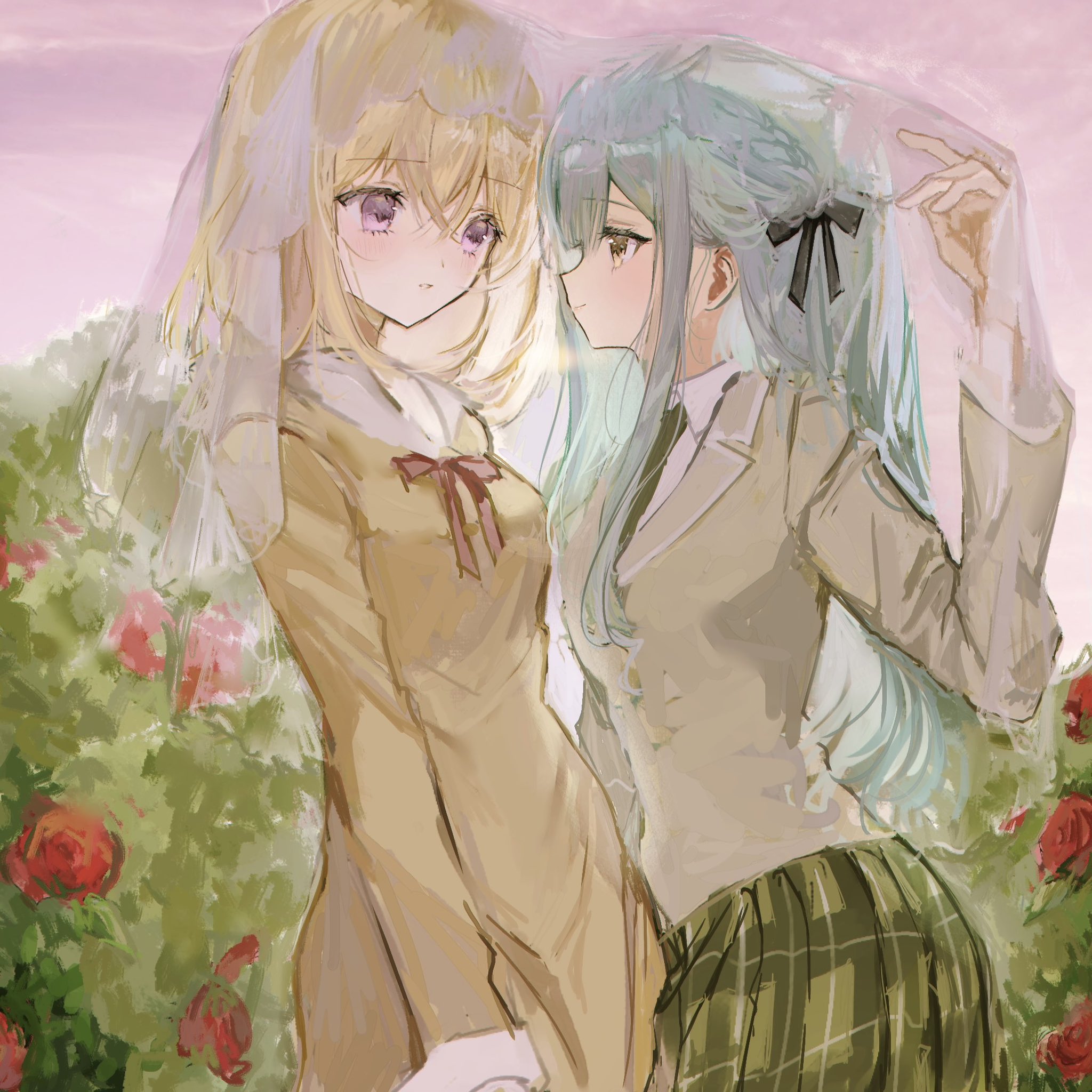 2girls bang_dream! bang_dream!_it's_mygo!!!!! blazer blonde_hair blue_hair commentary_request dress hair_ribbon highres jacket lapels long_hair looking_at_another misumi_uika multiple_girls outdoors plaid_clothes plaid_skirt purple_eyes ribbon school_uniform short_hair sinainaruayane skirt smile togawa_sakiko veil yellow_eyes