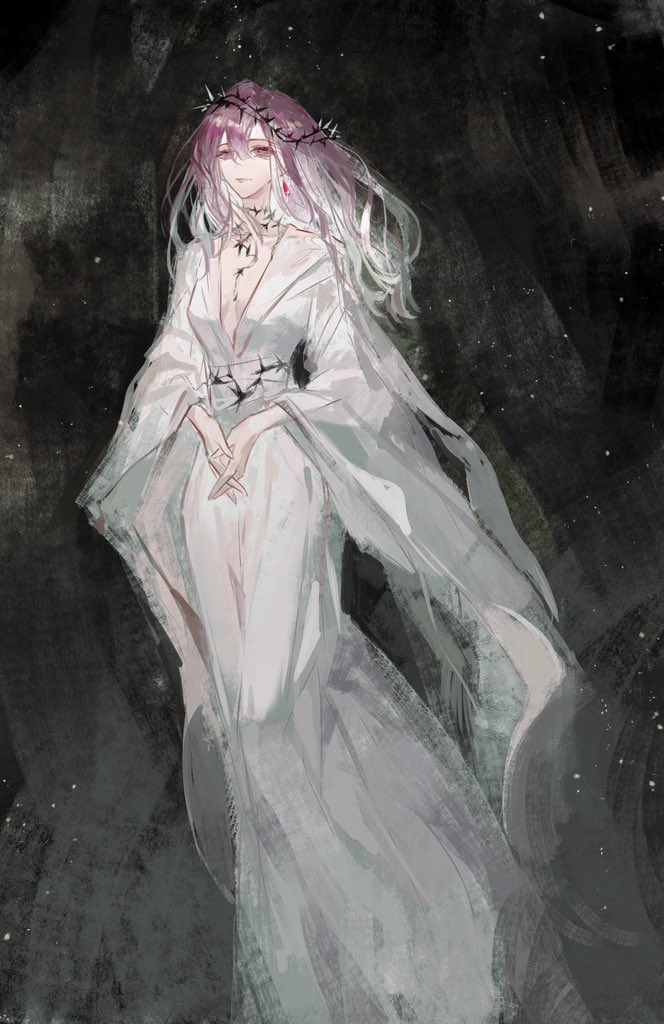 1girl blood commentary_request crown_of_thorns dress long_dress long_hair ludibianyuan own_hands_together path_to_nowhere purple_hair solo standing thorn_print thorns white_dress