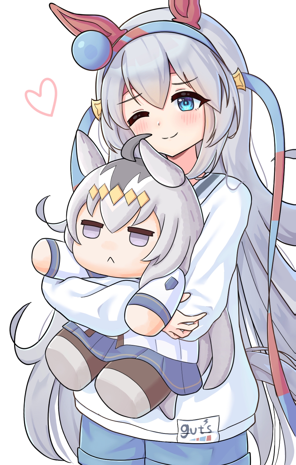 1girl animal_ears blue_eyes blue_hairband blue_shorts blush character_doll closed_mouth commentary doll ear_covers grey_hair grey_tail hair_between_eyes hairband headband heart highres holding holding_doll horse_ears horse_girl horse_tail hugging_doll hugging_object long_hair long_sleeves multicolored_hairband oguri_cap_(starlight_beat)_(umamusume) oguri_cap_(umamusume) one_eye_closed red_headband shirt shorts simple_background smile striped_clothes striped_hairband tail tamamo_cross_(umamusume) two-tone_hairband umamusume very_long_hair white_background white_shirt zaijian_(xxx1148297)