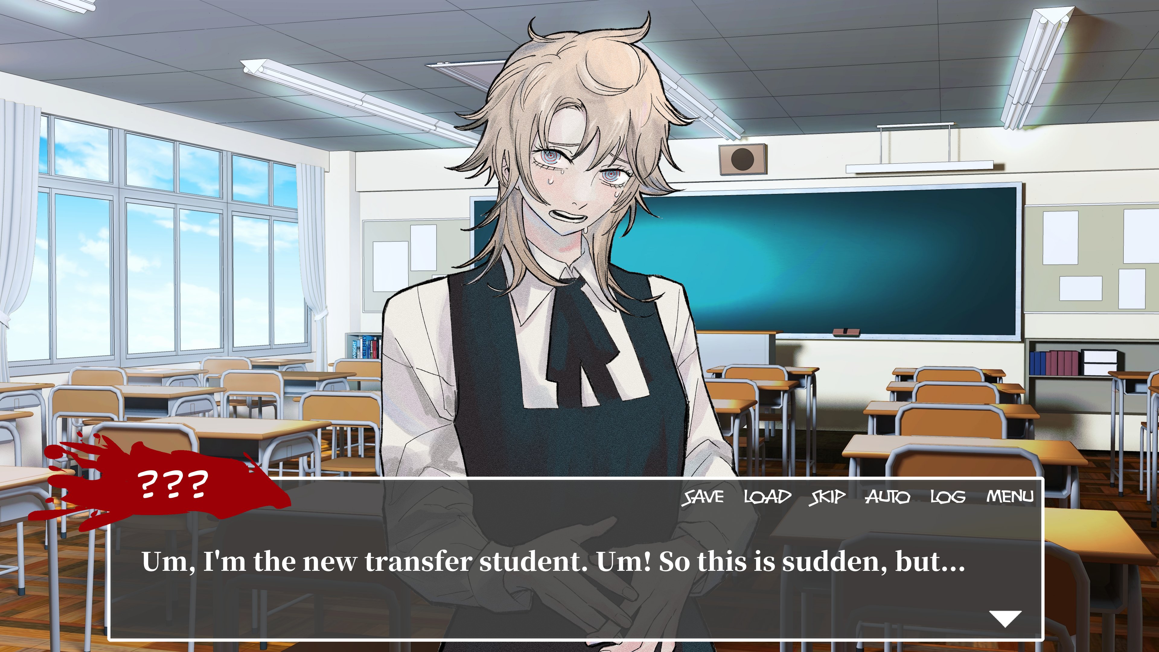 1girl absurdres black_dress blonde_hair blue_eyes chainsaw_man chair chalkboard classroom commentary desk dress english_commentary english_text fake_screenshot famine_devil_(chainsaw_man) fourth_east_high_school_uniform highres machipachi1901 medium_hair neck_ribbon open_mouth pinafore_dress ribbon school_chair school_desk school_uniform sleeveless sleeveless_dress sleeves_past_wrists solo sweat tearing_up upper_body visual_novel window