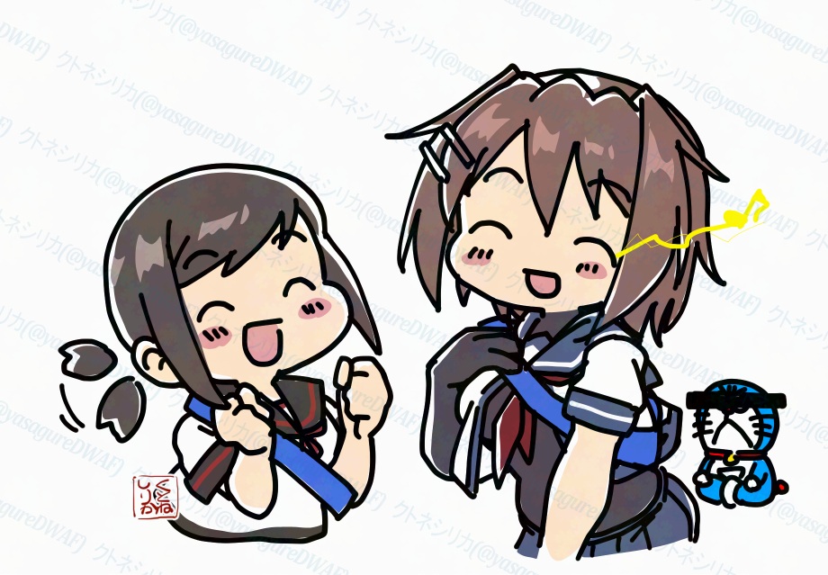 bar_censor black_hair black_sailor_collar blue_sash breasts censored censored_identity closed_eyes commentary_request crossover doraemon doraemon_(character) elbow_gloves expressive_hair fubuki_(kancolle) fubuki_kai_ni_(kancolle) furutaka_(kancolle) furutaka_kai_ni_(kancolle) gloves hair_wagging kantai_collection kutone_shirika low_ponytail medium_breasts ponytail sailor_collar sailor_shirt sash school_uniform serafuku shirt short_hair shoulder_sash single_glove white_shirt