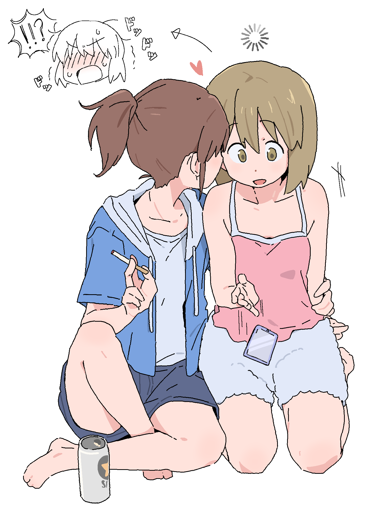 2girls bare_arms barefoot blue_hoodie blue_shorts blush brown_eyes brown_hair camisole cigarette city_(arawi_keiichi) commentary grey_shirt hand_on_another's_waist heart highres holding holding_cigarette hood hoodie loading_icon multiple_girls nagumo_midori niikura_(city) pink_camisole ponytail sapporo_beer seiza shirt short_hair shorts simple_background sitting smoking white_background wichimi yuri