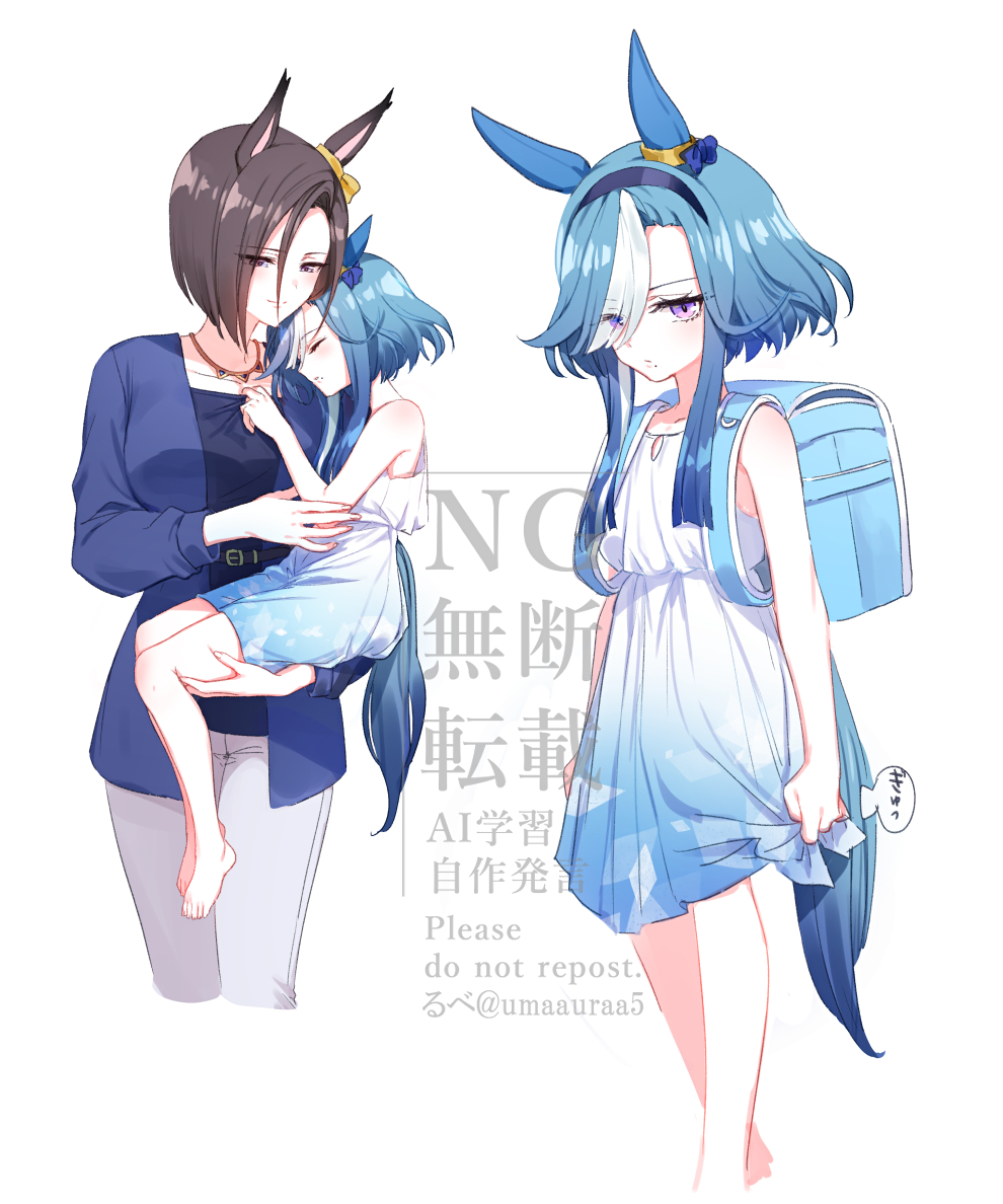 2girls admire_groove_(umamusume) age_difference aged_down air_groove_(umamusume) animal_ears backpack bag barefoot black_shirt blue_bow blue_dress blue_hair blue_shirt blush bow brown_hair carrying carrying_person closed_eyes collarbone commentary_request cropped_legs dress ear_bow ear_covers gradient_clothes gradient_dress hair_between_eyes hairband hand_on_another's_chest horse_ears horse_girl horse_tail jewelry mole mole_under_mouth multicolored_hair multiple_girls necklace open_clothes open_shirt pants profile purple_eyes randoseru romi_(346_ura) shirt short_dress short_hair short_hair_with_long_locks sidelocks simple_background smile streaked_hair tail time_paradox umamusume umamusume_horse_relations white_background white_dress white_pants white_streaks