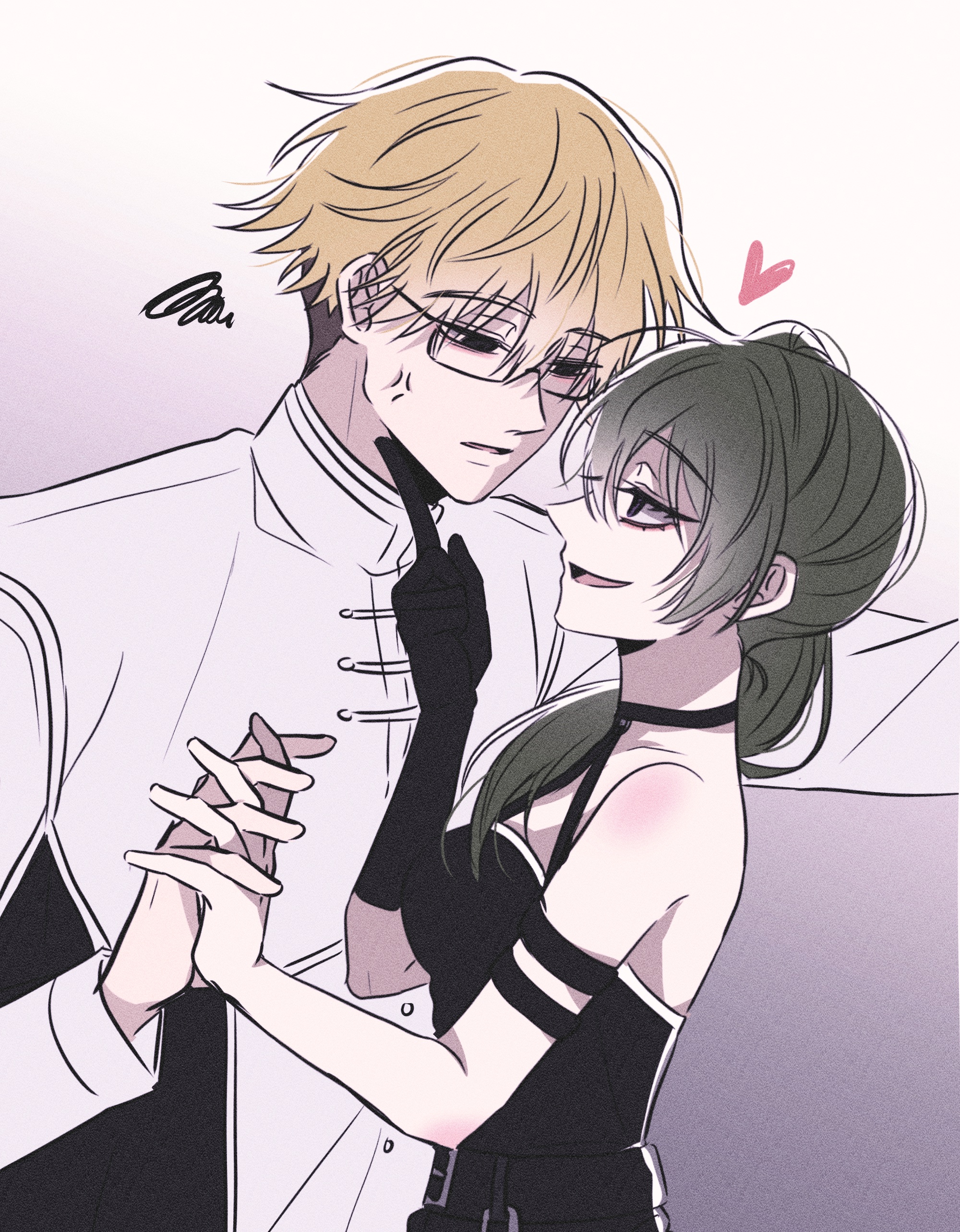 1boy 1girl absurdres backless_dress backless_outfit black_choker black_gloves blonde_hair choker commentary_request dress frifri1213 gloves green_hair highres korean_commentary land_(sousou_no_frieren) open_mouth smile sousou_no_frieren ubel_(sousou_no_frieren)