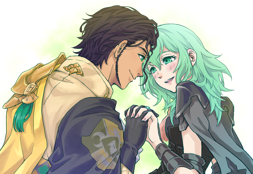 1boy 1girl breasts brown_hair claude_von_riegan claude_von_riegan_(timeskip) commentary_request couple dark-skinned_male dark_skin female_byleth_(awakened)_(fire_emblem) female_byleth_(fire_emblem) fire_emblem fire_emblem:_three_houses green_eyes green_hair hetero holding_hands medium_breasts mojakkoro nintendo