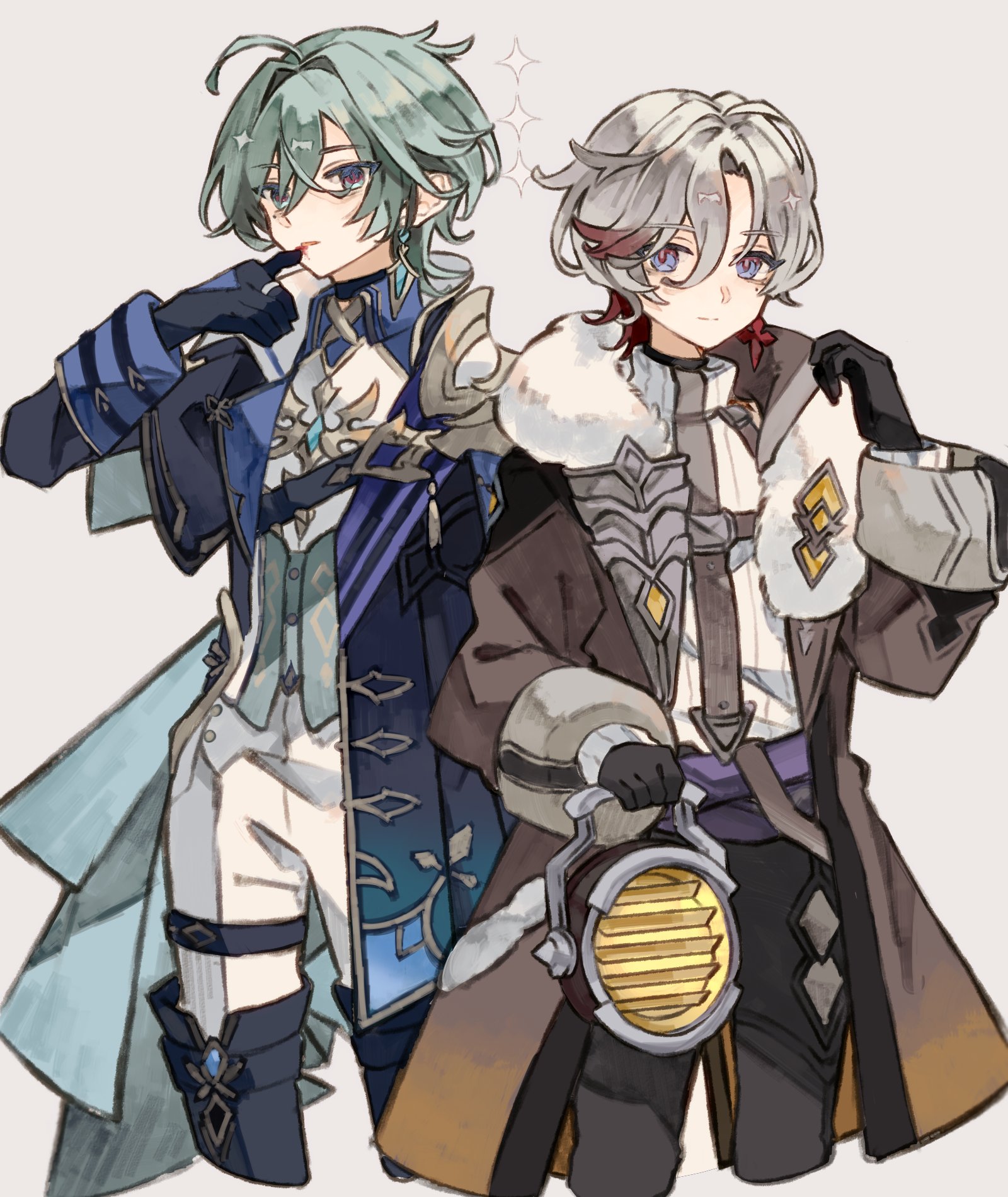 2boys armor black_boots black_choker black_gloves black_pants blue_coat blue_hair boots choker closed_mouth coat collared_shirt commentary_request cropped_legs double-parted_bangs finger_to_mouth fur-trimmed_coat fur_trim genshin_impact gloves grey_coat grey_hair highres holding holding_lantern illuga_(genshin_impact) lantern lohen_(genshin_impact) long_sleeves looking_at_viewer male_focus multicolored_eyes multiple_boys pants parted_hair pauldrons shirt shoulder_armor single_pauldron toskogahazan turtleneck white_background white_fur white_pants white_shirt wing_collar
