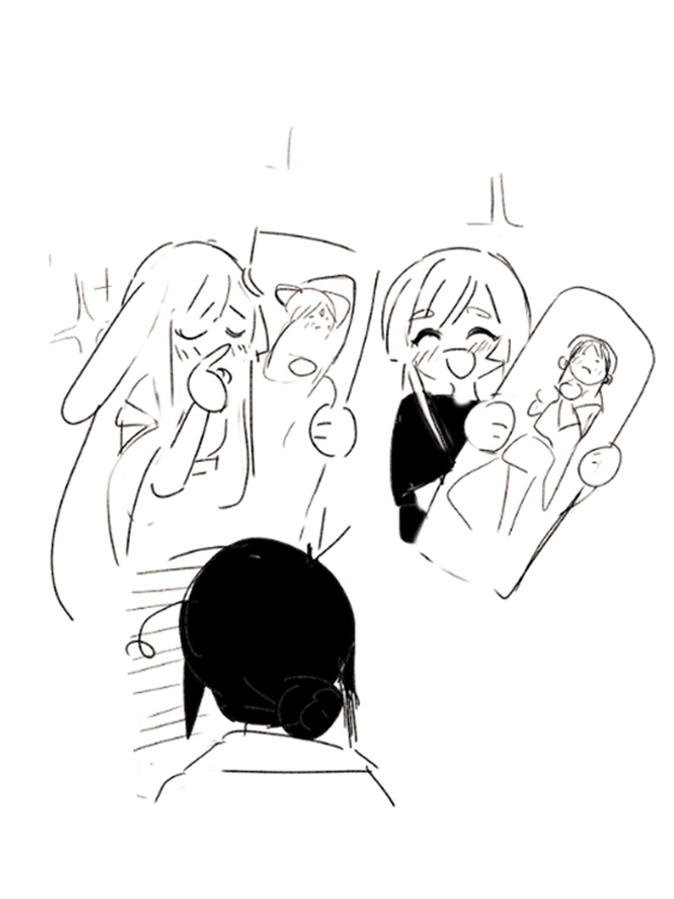 3girls animal_ears blush cho_kaguya-hime! closed_eyes commentary crescent crescent_hair_ornament cropped_torso dakimakura_(object) facing_another greyscale hair_ornament highres hixii1238 holding kaguya_(cho_kaguya-hime!) long_hair lop_rabbit_ears monochrome multiple_girls pillow rabbit_ears runami_yachiyo sakayori_iroha short_sleeves sketch sparkle white_background